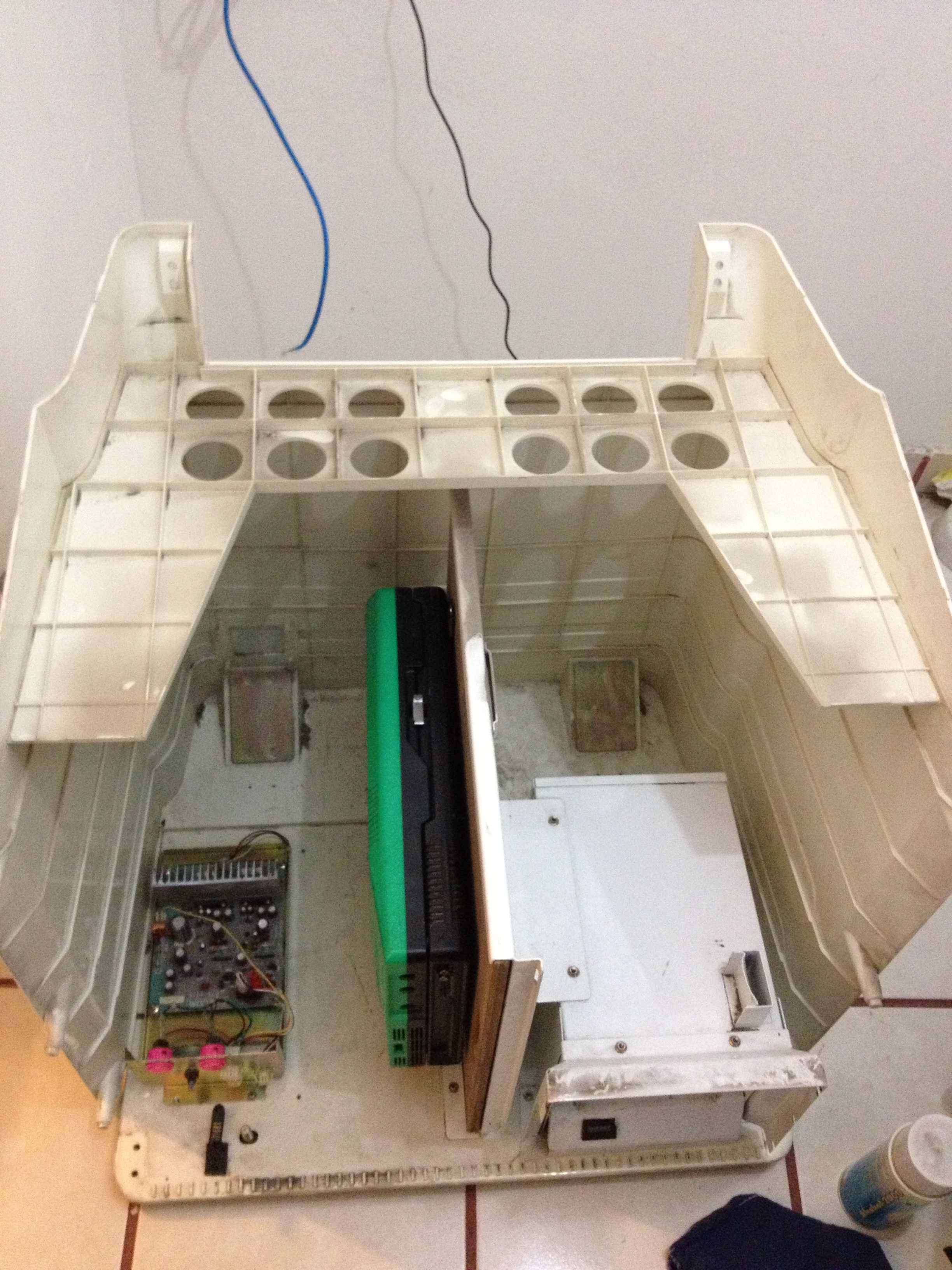 Antes que nada, como tal vez ya hayan visto, la máquina pesa como 110 kg. lo cual hace un poco complicada la labor de desarmar/armar. Para quitar la sección del tablero se deben quitar unos 14 tornillos y acostar el gabinete para poder sacar esta pieza. Los tornillos se encuentran en los laterales de la pieza del tablero (6 Torx de seguridad), la parte de abajo de la máquina (4 de cruz) y en la parte interna del tablero, están sujentando unas piezas grandes metálicas (4 de cruz). Acostando la máquina se puede sacar esta pieza sin problema.
