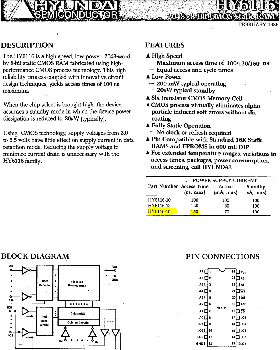 En esta búsqueda elegimos la HY6116 y posteriormente revisamos el datasheet para confirmar que el pinout es idéntico. y solo quedaría elegir el modelo de velocidad 150ns.