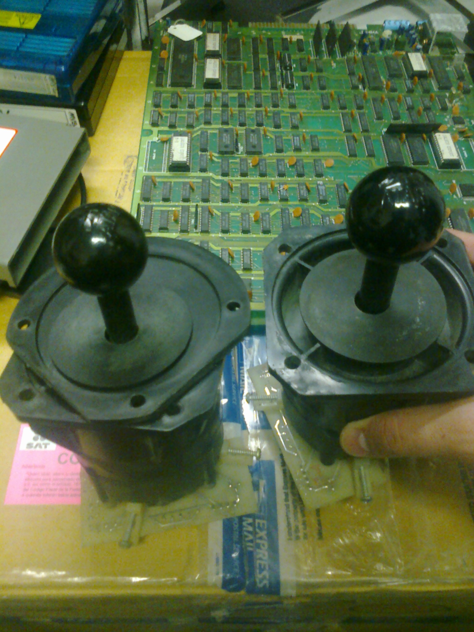 La placa es Escape From The Planet of The Robot Monsters de Atari, y usa esos joysticks especiales, aunque un miembro de KLOV ya diseñó una placa para adaptar joysticks normales de 8 posiciones.