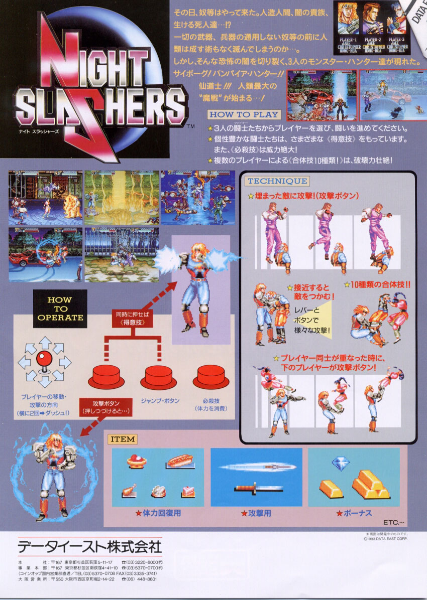 Continuando con grandes beat'em ups poco conocidos, a continuación les propongo un excelente exponente de scroll lateral para tres jugadores simultáneos, desarrollado por Nihon Bussan/AV Japan en 1993 y publicado por Data East en ese mismo año. El plot es simple, los zombies, vampiros, hombres lobo y otros monstruos se están apoderando de nuestras ciudades; entre los pocos humanos que quedan surgen tres héroes que intentarán detenerlos, Jake el "Psychic Cyborg" americano cuyos brazos fueron substituídos por brazos robóticos, Christopher el afamado caza-vampiros europeo, y Hong Hua la más destacada artemarcialista de Asia.