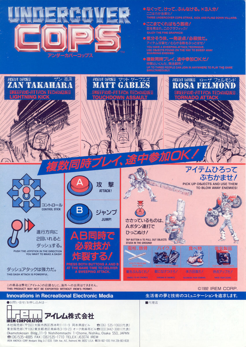 Se rumora que la primera versión japonesa no estaba totalmente terminada cuando la lanzaron al mercado y de ahí que sea increíblemente difícil de terminar; la versión japonesa tiene varias diferencias a la del resto del mundo o "Undercover Cops Alpha Renewal Version"; en la versión japonesa nuestros héroes tienen más movimientos que incluyen ataques que se logran al correr y saltar, dos tipos diferentes de aventar a los enemigos y un ataque aéreo especial que no incluye la versión del resto del mundo.