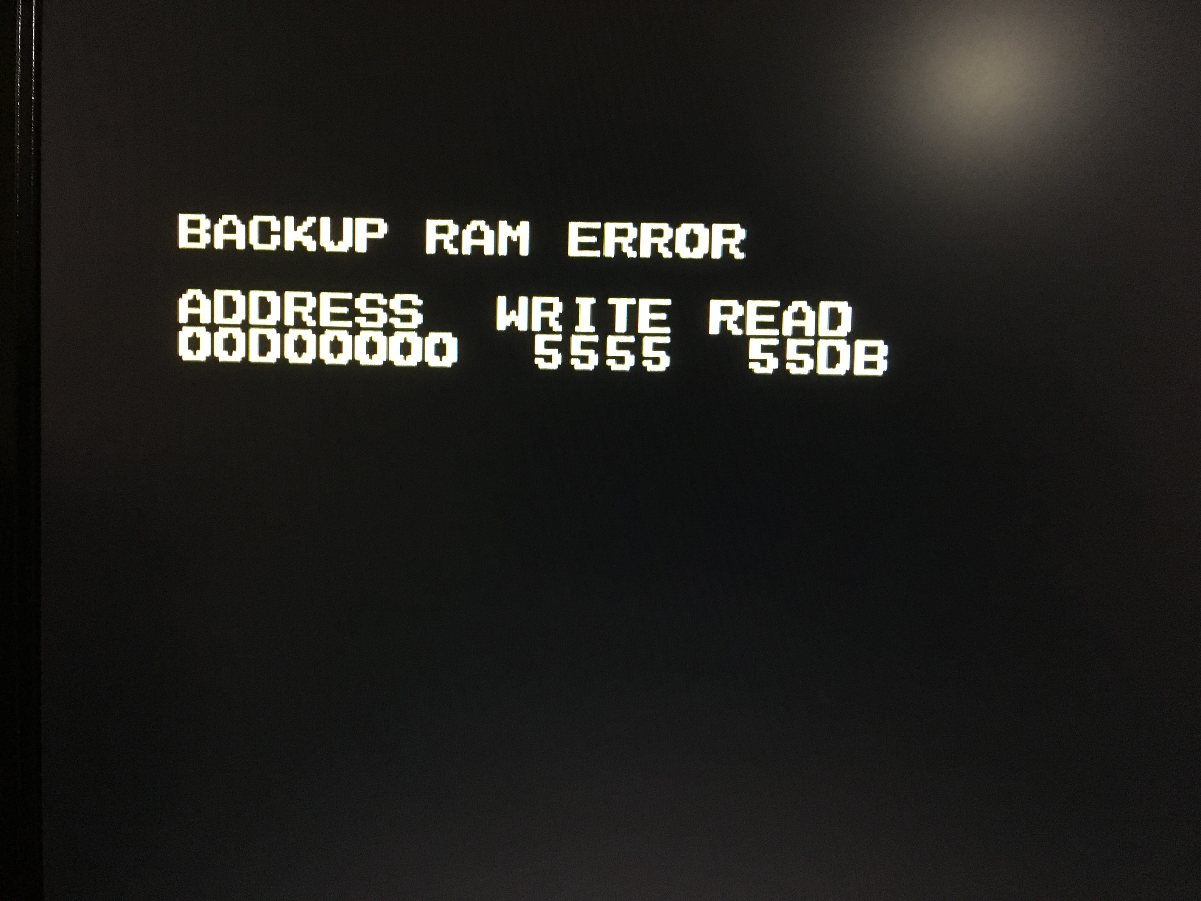 Ya en detalles después de eso, el patrón que está escribiendo es 0x5555 que se traduce a 0101 0101 0101 0101 en binario, y está leyendo 0x55DB o 0101 0101 1101 1011. Es decir, hay varios bits corruptos (3) al escribir a la dirección 0x00D00000 de la RAM de backup. Esto puede deberse a daño en pistas, a un chip en el BUS o a problemas en dicha memoria.
