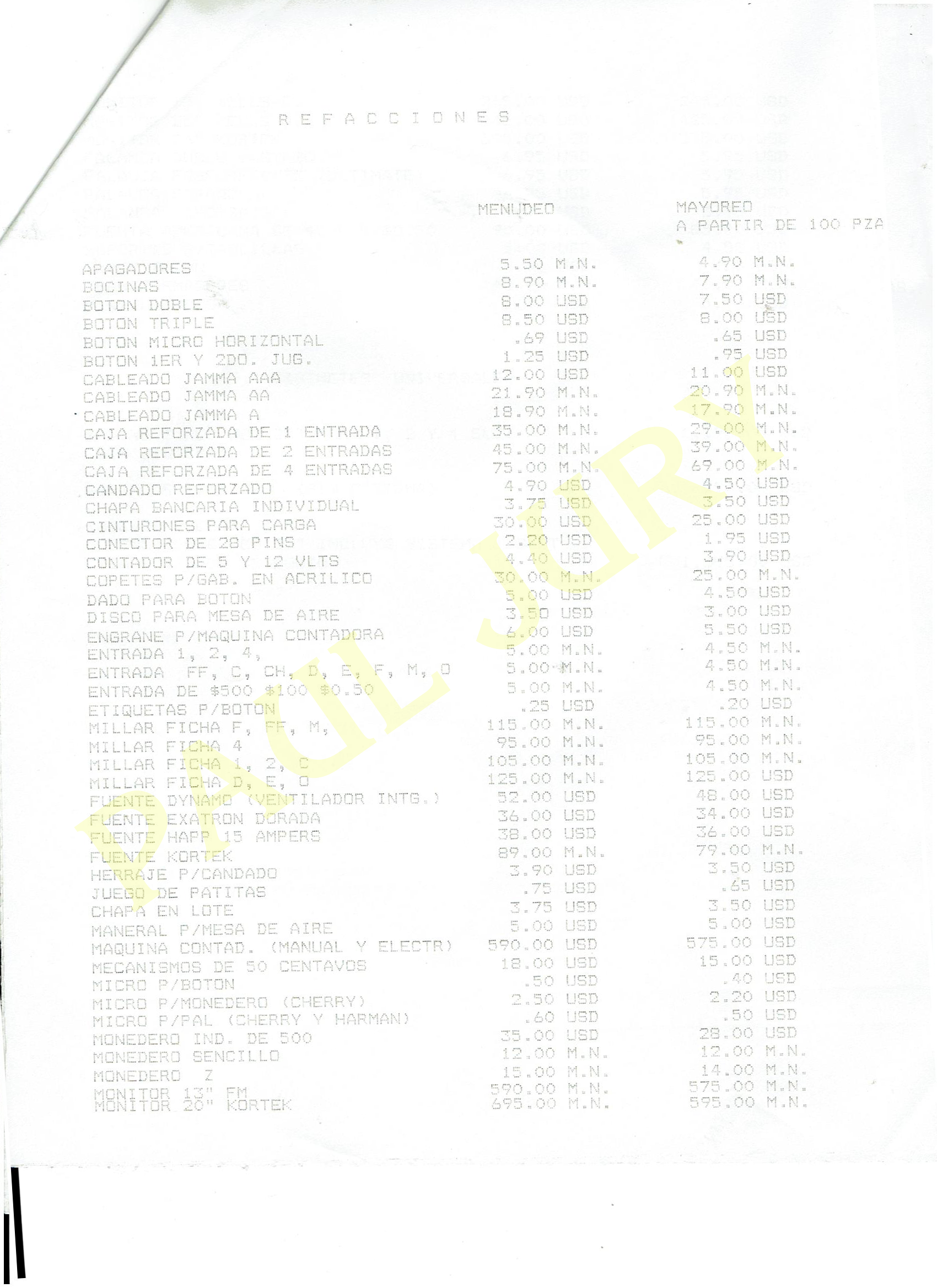 Lista de precios de refacciones y accesorios para los arcade de Video juegos Vuelo 23