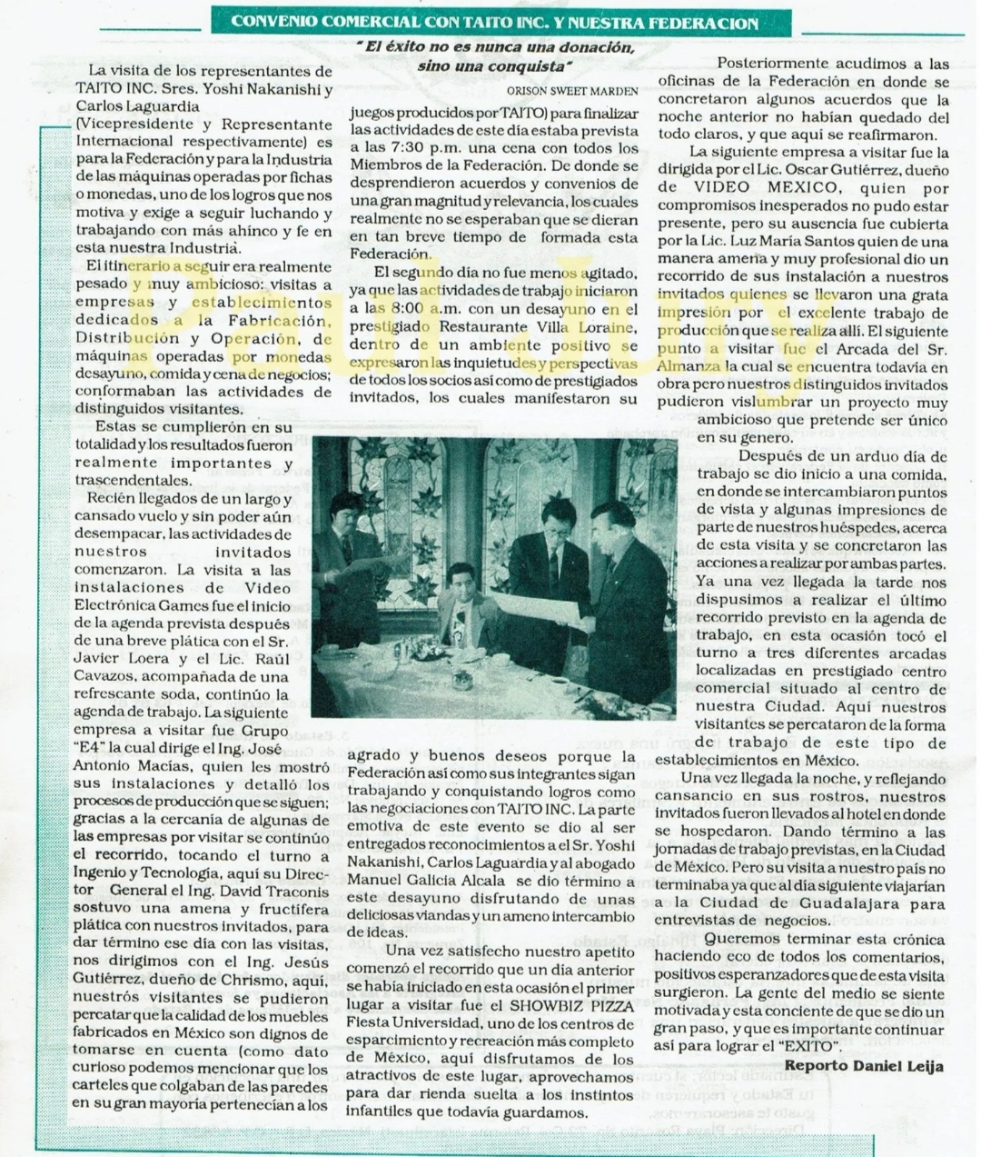 Los recibieron, gente de la federación mexicana de videojuegos. con el interés de poder trabajar en adelante con los distribuidores en México respecto a su consola Taito F3 Sistem, este que ya sé había presentado en anteriores eventos con juegos como Taito Cup finals y el Hatrick Hero 93 El cual vendió bastante en México, pero la mayoría eran equipos destinados para Asia, estos empezaban a tener gusto en mercado de México y con el fin de atacar la problemática de la piratería y el contrabando de pcb que llegaban a México de Asia las cuales no deberían estar por el hecho de qué Taito Estados Unidos debería de surtir para México.