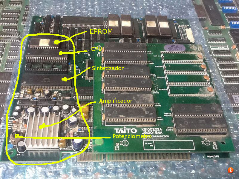 Asumo que el chip al que se le quedaron algunas terminales en el socket es el que señalo como EPROM, al contar el numero de patas de la EPROM. Esta es la ROM que contiene el código para el CPU que maneja el audio.