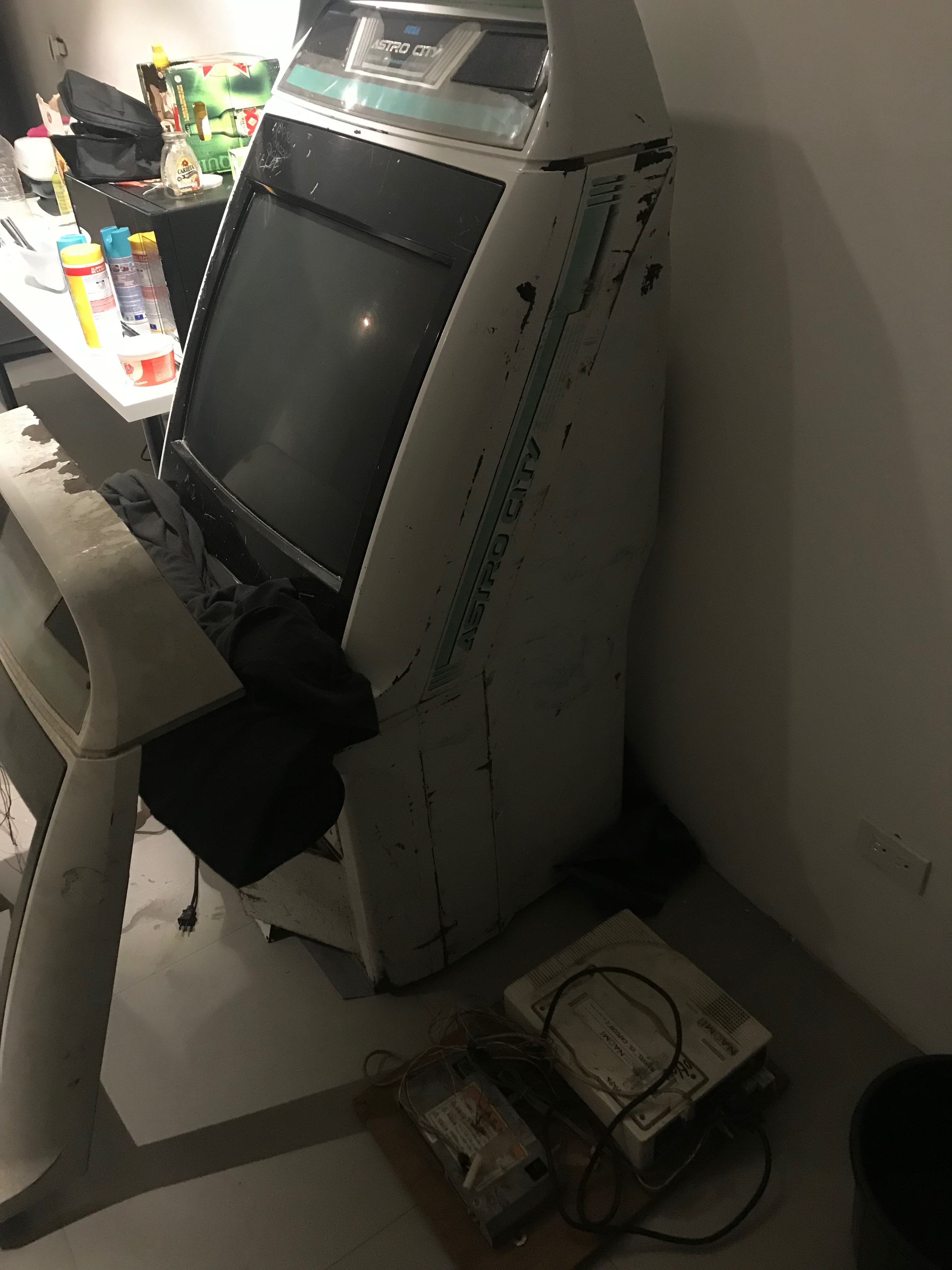 Hace un año me di a la tarea de buscar una ASTRO CITY ya que desde la primera vez que vi una en un lugar de Arcades me gustó bastante, tenían ese look japonés de carros de carrera callejeros :P acá en Tijuana no me tocó ver más que 1 establecimiento con algunas ASTRO y ya sabía que iba a ser difícil encontrarla, al final encontré 1 en un grupo de ventas de Facebook, estaba en Mexicali (a 3 horas de distancia de Tijuana) al final el vendedor solo me daba largas para ir a verla y no se concretó el trato. 6 meses después encontré una, ahora en Tijuana, lo contacté y me respondió, inmediato fui a verla. Estaba en un patio muy sucio a la interperie, me dijo que antes la usaba como multijuegos pero que ese negocio ya murió y estuvo mucho tiempo en la calle. La conectó y para mi sorpresa se veía el CRT, como cuando una TV no tiene señal y me dijo que no tenía placa. Llegamos a un trato de $1000 pesos mexicanos y la dejé en mi sala. Hace poco conseguí una placa de Marvel vs Capcom 2 con el sistema NAOMI y un convertidor JAMMA por $3000 pesos mexicanos y creo que ya es hora de restaurarla.