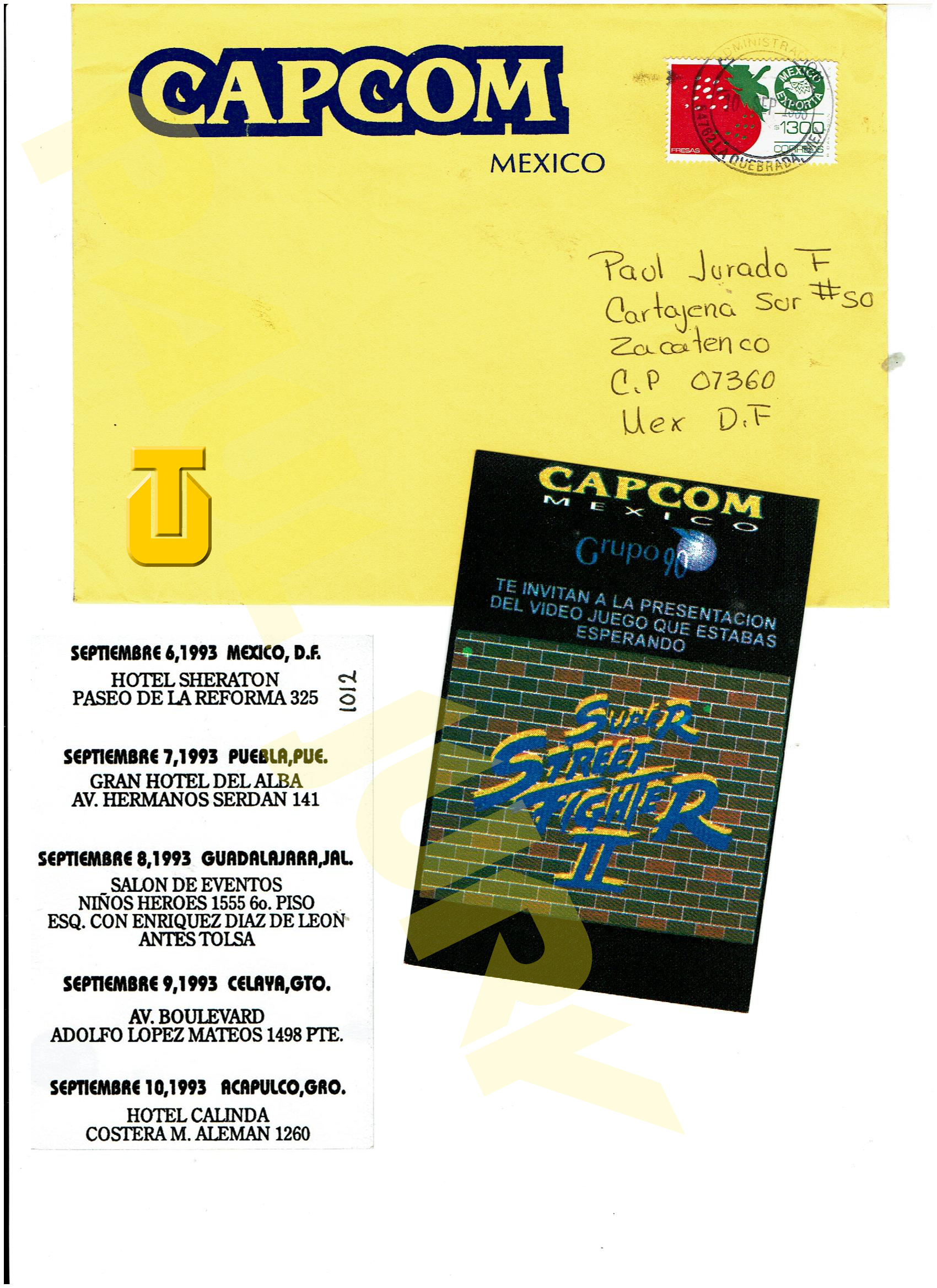 carta invitación de capcom México para dar a conocer el SUPER STREET FIGHTER 2 EN EL CPS 2 y los lugares donde se presentarian por dia