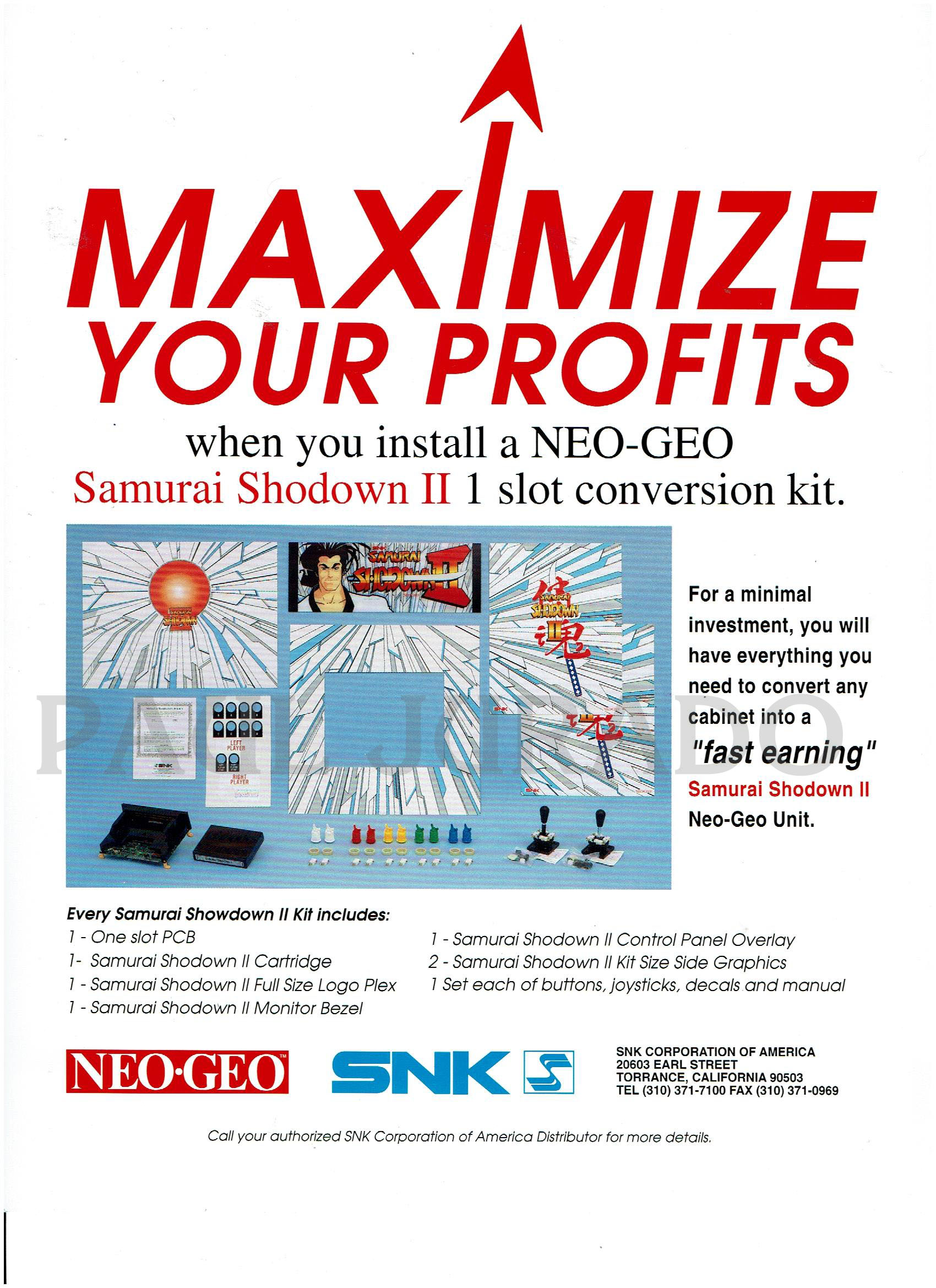 En el Flyer anuncian el kit para convertir el gabinete que tuvieras en uno renovado con todo lo necesario para actualizarlo y verse como un gabinete original de Samurai shodown II, te daban tips para no tener una falla en tu MVS de dos o mas slots, que si pasaba seguido, que el cartucho se afloja mientras transportan el gabinete y cuando encendían el equipo, marcaba un error ya que el cartucho quedaba ladeado en el socket del slot y causaba un corto en el sistema. otro punto importante en el panfleto dice que invirtiendo solo 495usd en el cartucho en 40 días podías recuperar y ganar hasta 4000 usd ,esto era algo exagerado aunque cobraran el juego a medio dolar . también te invitaban al concurso para ganar un cartucho del juego, y anunciaban los cambios del personal de snk de estados unidos.