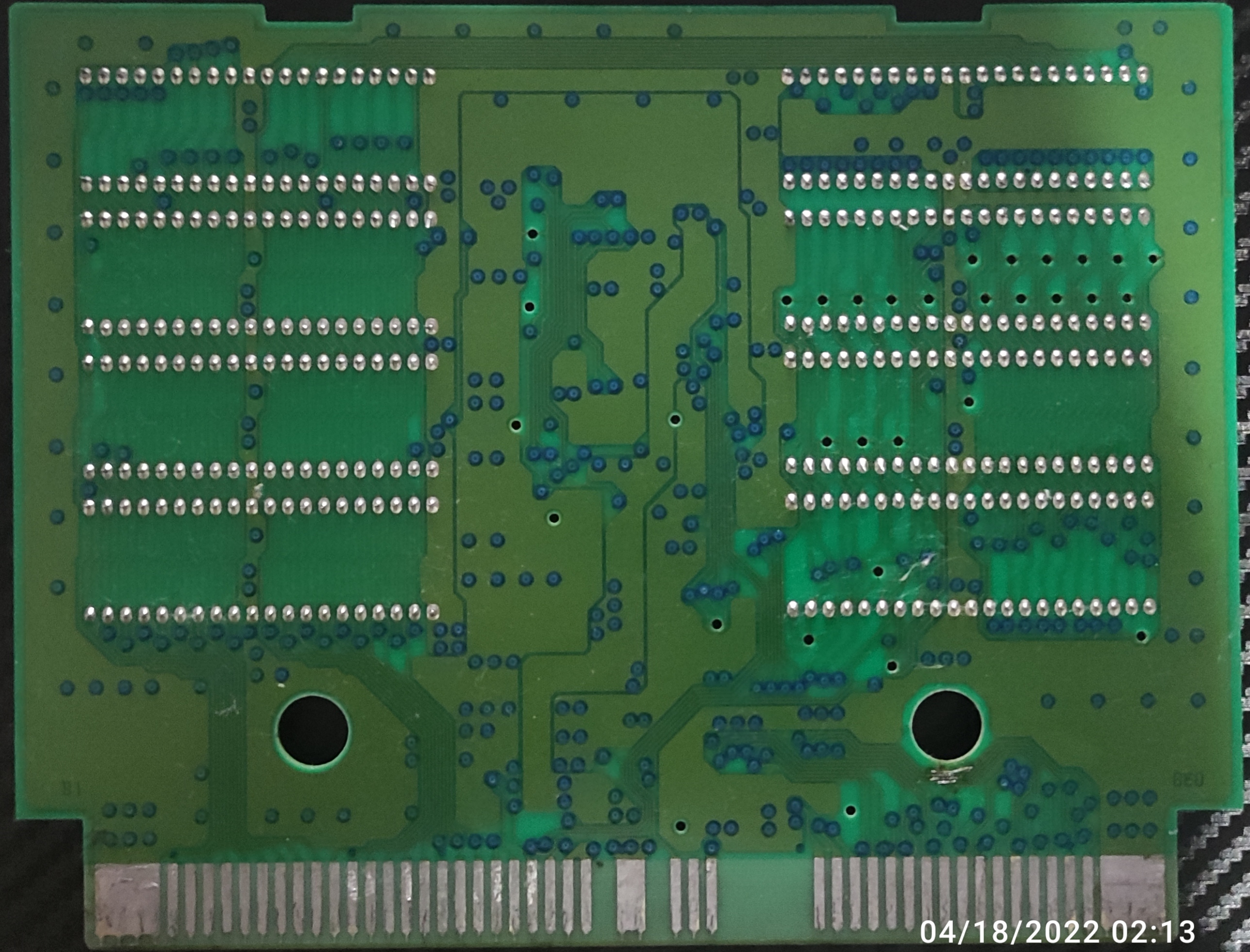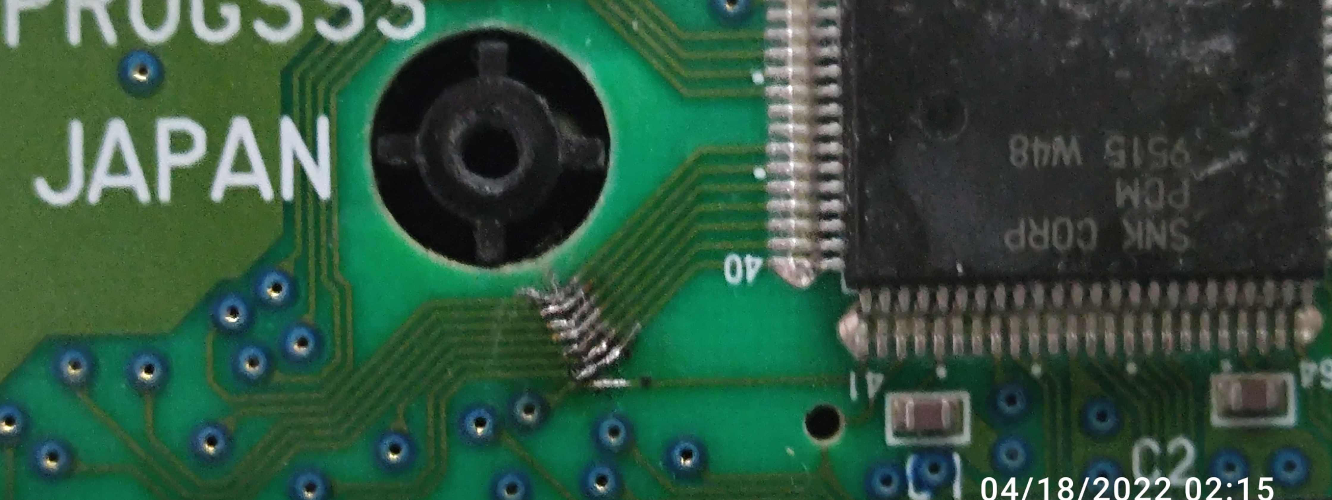Buen Dia, busco de su ayuda para poder reparar un cartucho MVS de KOF 96 "Japones", lo compre en un lote de juegos y el vendedor me indico que tenia problemas de audio, lo abri para limpiarlo y ver si encontraba algún pin roto o sucio, después de revisar cuidadosamente encontré que tenia un golpe en el mismo lugar del tornillo faltante, lo cual rompio las pistas de ambos lados de la tarjeta superior, pero no afecto aparentemente la tarjeta inferior, intente reparar las pistas sin exito al no tener experiencia en soldar pistas tan diminutas, con ayuda de un video de un amigo de otro estado pude hacer el soldado de cable de cobre con ayuda de un microscopio USB de las pistas lo mejor que pude, pase de tener un sonido distorsionado a no tener ningún sonido, adjunto las fotos de las placas y el test del UNIBIOS para ver si eso puede ayudar en algo.