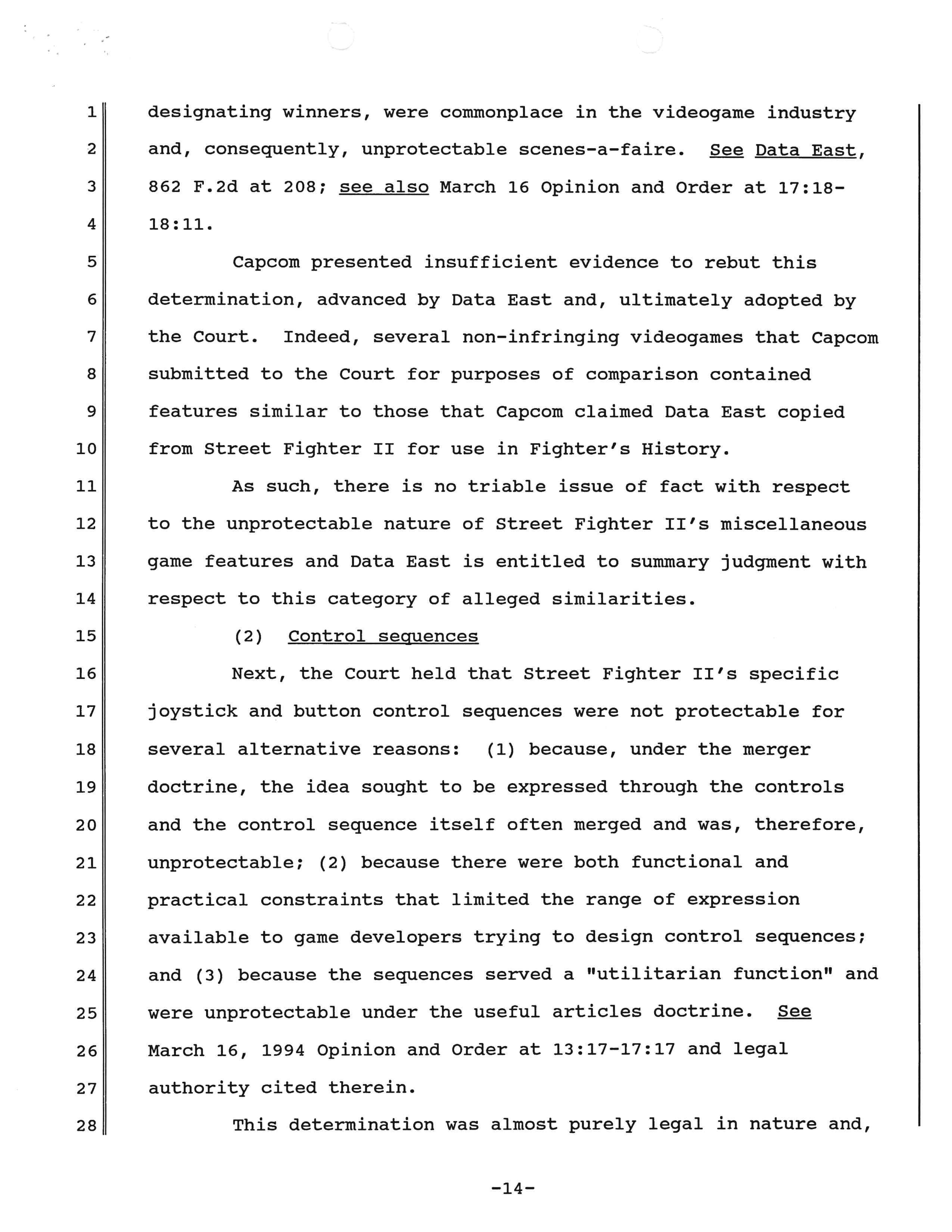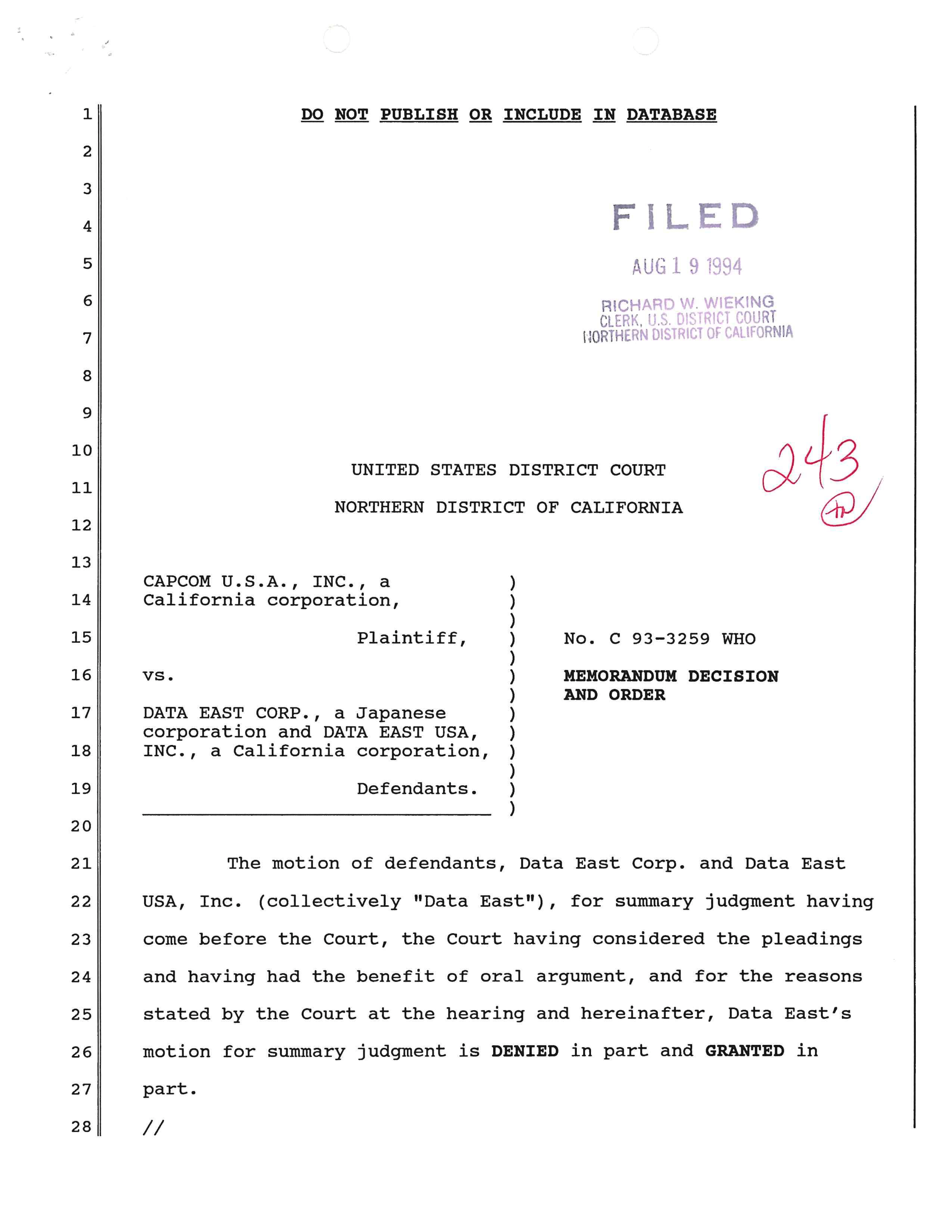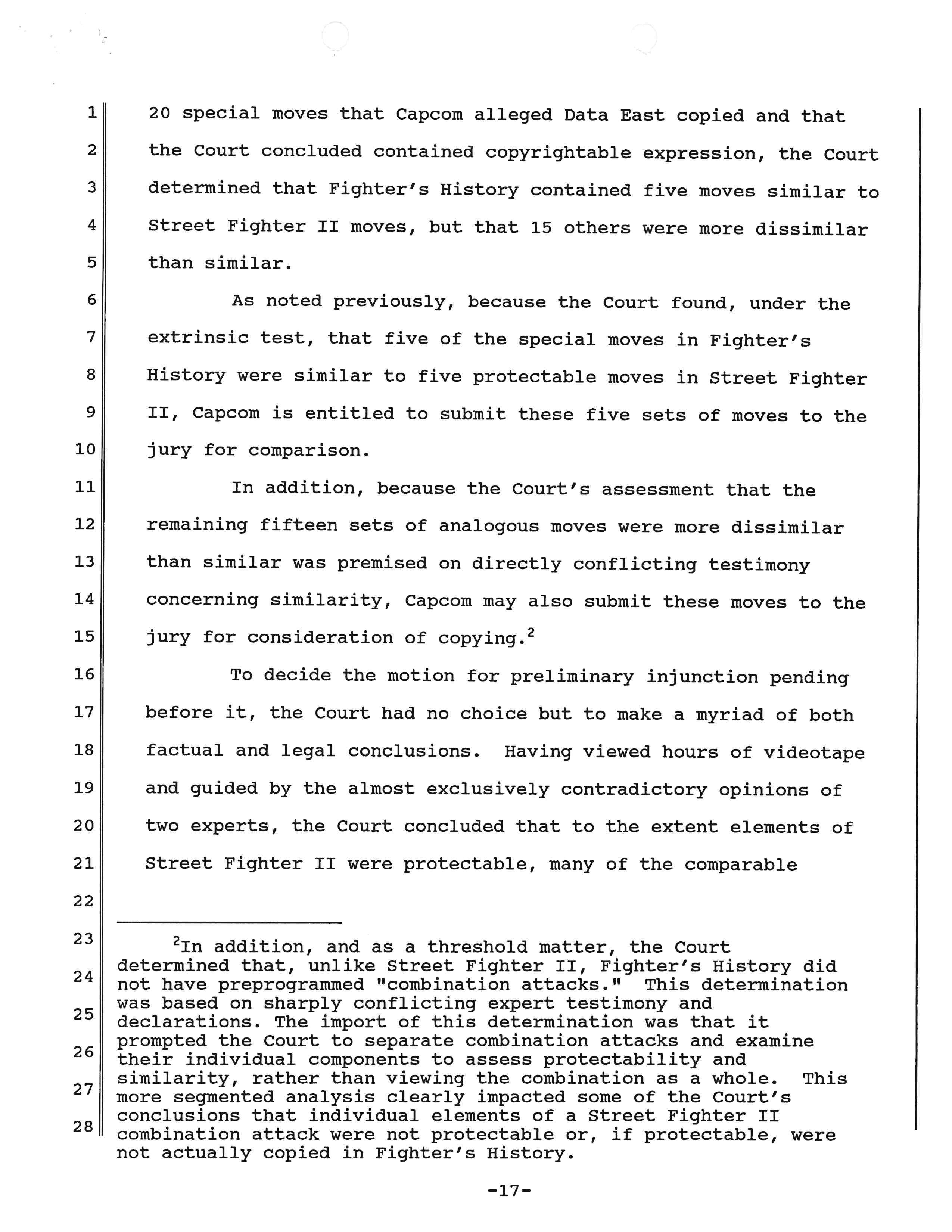 En 1993 Capcom, demandaba a Data East por exactamente algo no tan claro, que era parte de los conceptos de personajes, poderes, jugabilidad, que el juego de Data East usaba en Fighter's history basados en el Street Fighter 2. en el video muestran la comparativa y desestimación de tales argumentos imputados a Data East, este es uno de los dos videos que presentaron ante el juez. sin duda muy sonado en el medio en esos años, lo curioso de esta demanda, es que fue hecha en estados unidos y no en Japón siendo dos compañías originarias de Japón, el caso se presenta en california, donde Capcom tenia una de sus filiales. aun que se rumorea que solo se hizo por capricho de los ejecutivos de Capcom Estados Unidos, por ver si ganaban dinero de ello mas que por cerrarles el mercado a Data East. les dejo un link del video en youtube y las fotos del veredicto del juicio.