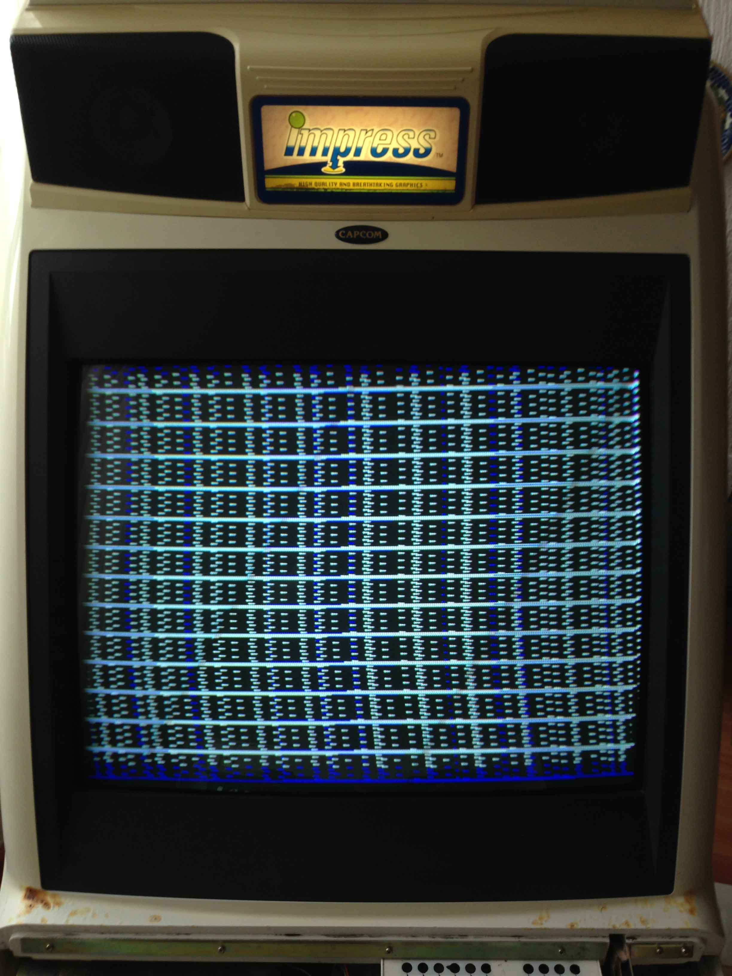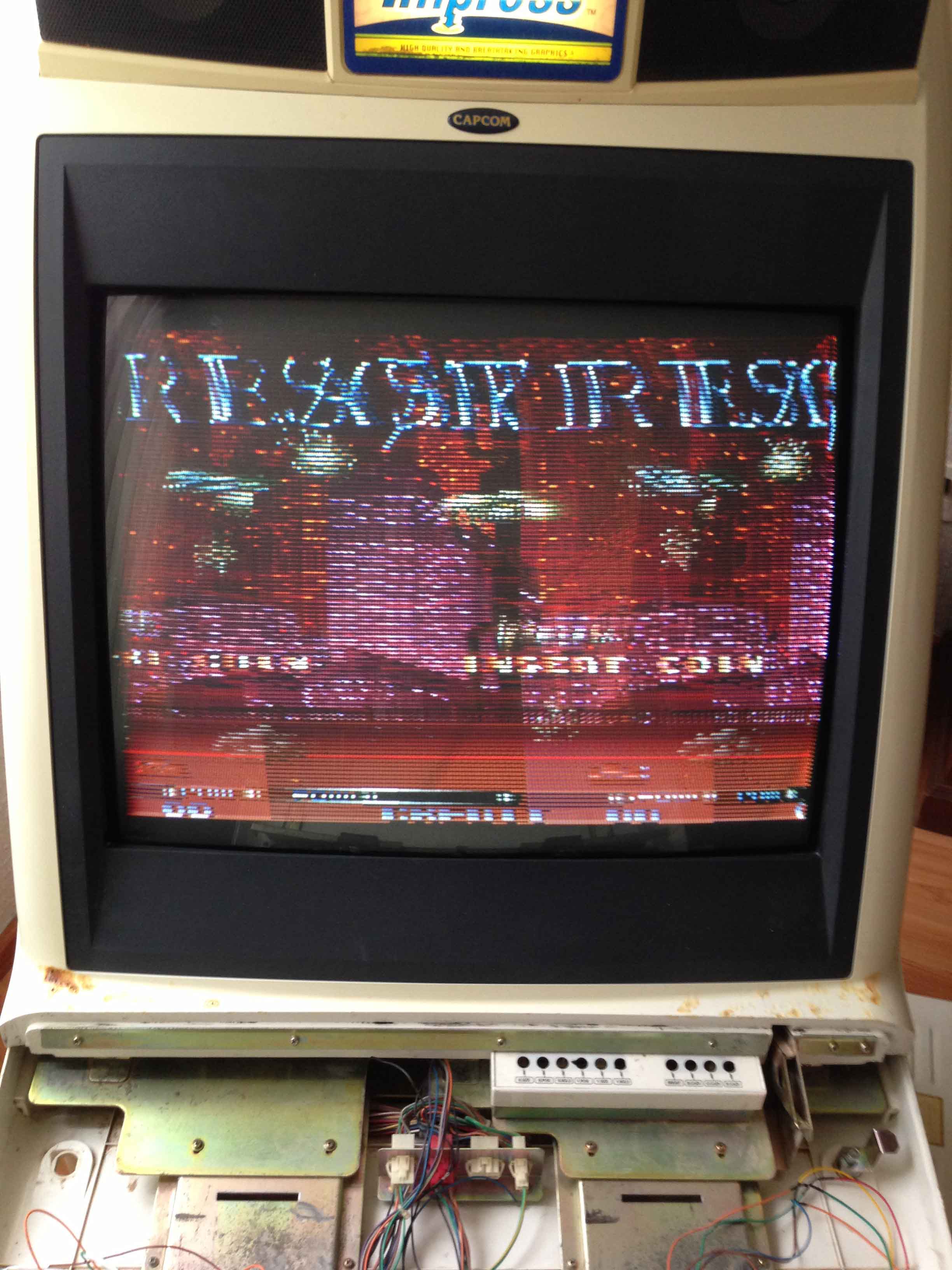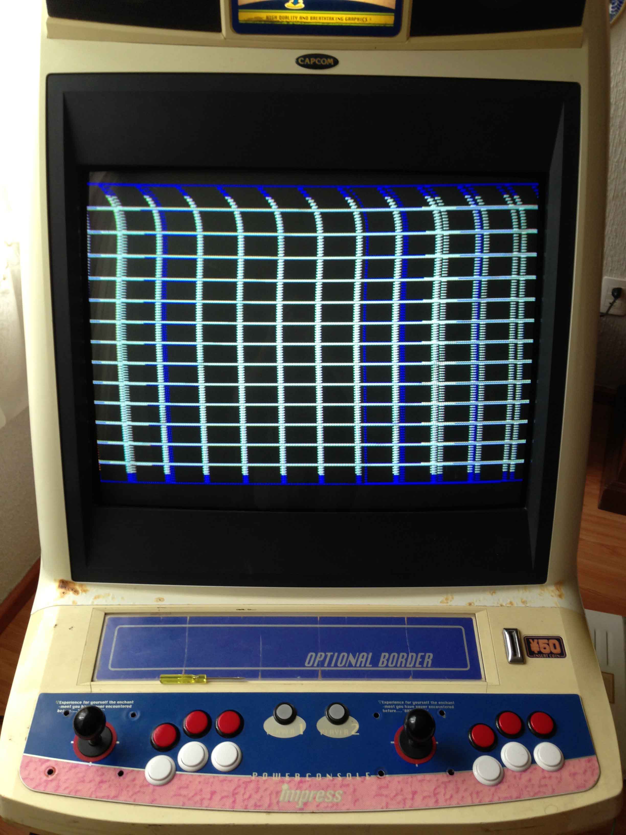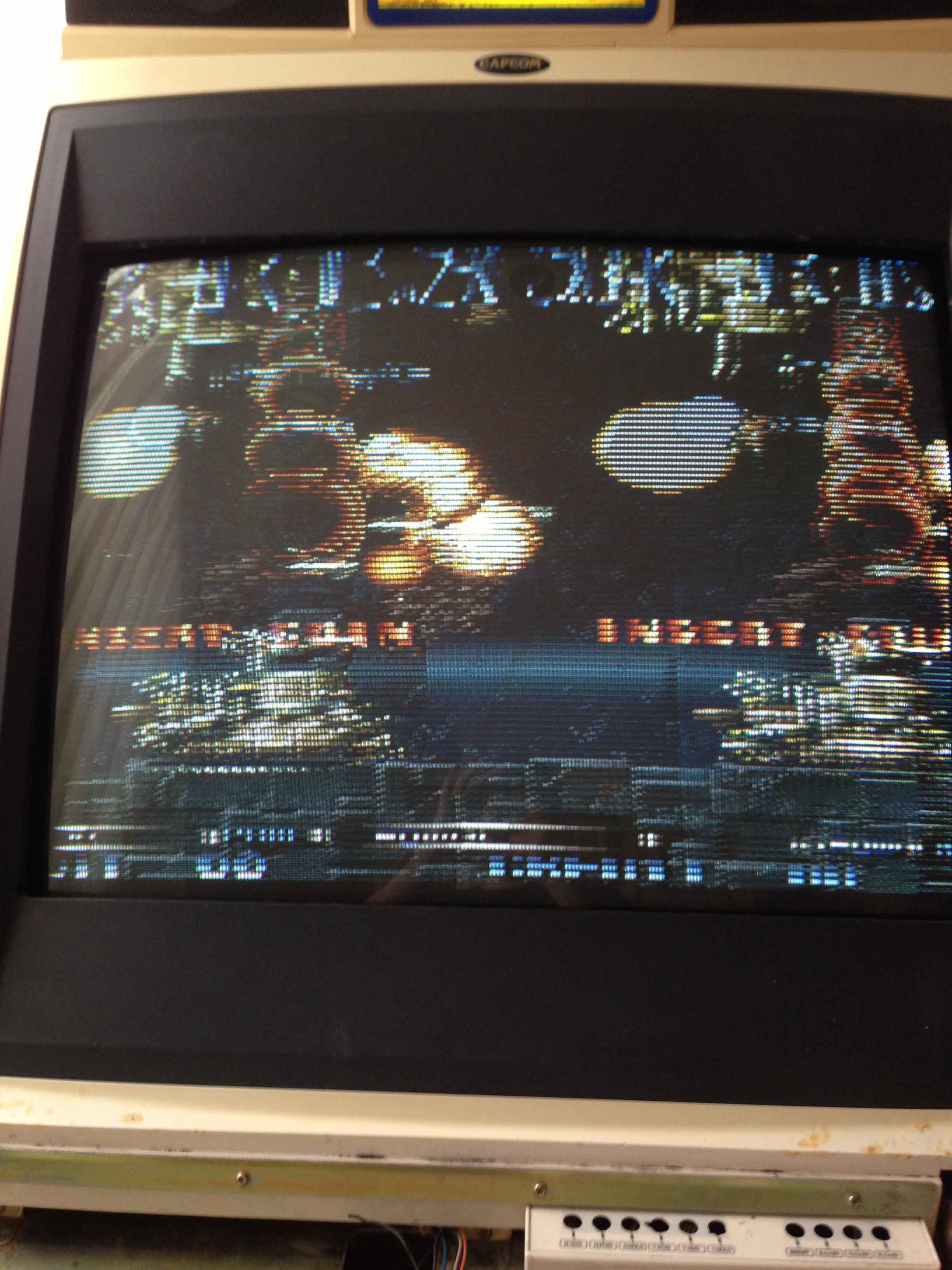 La única placa que tiene imagen sin problemas es con la que venía mi máquina, conseguí prestadas otras tres placas para probar que tal jalaban y resulta que todas tienen un problema de sincronía y por más que muevo los potenciómetros que controlan el V.HOLD y H.HOLD lo más que logro es sacar imágenes cortadas como las que verán en las imágenes. Esta semana estaré probando con diferentes técnicos que a sugerencia de Artemio es lo que más se recomienda, solamente subo esto para documentar y saber si alguien ha tenido el mismo problema y como lo ha solucionado.
