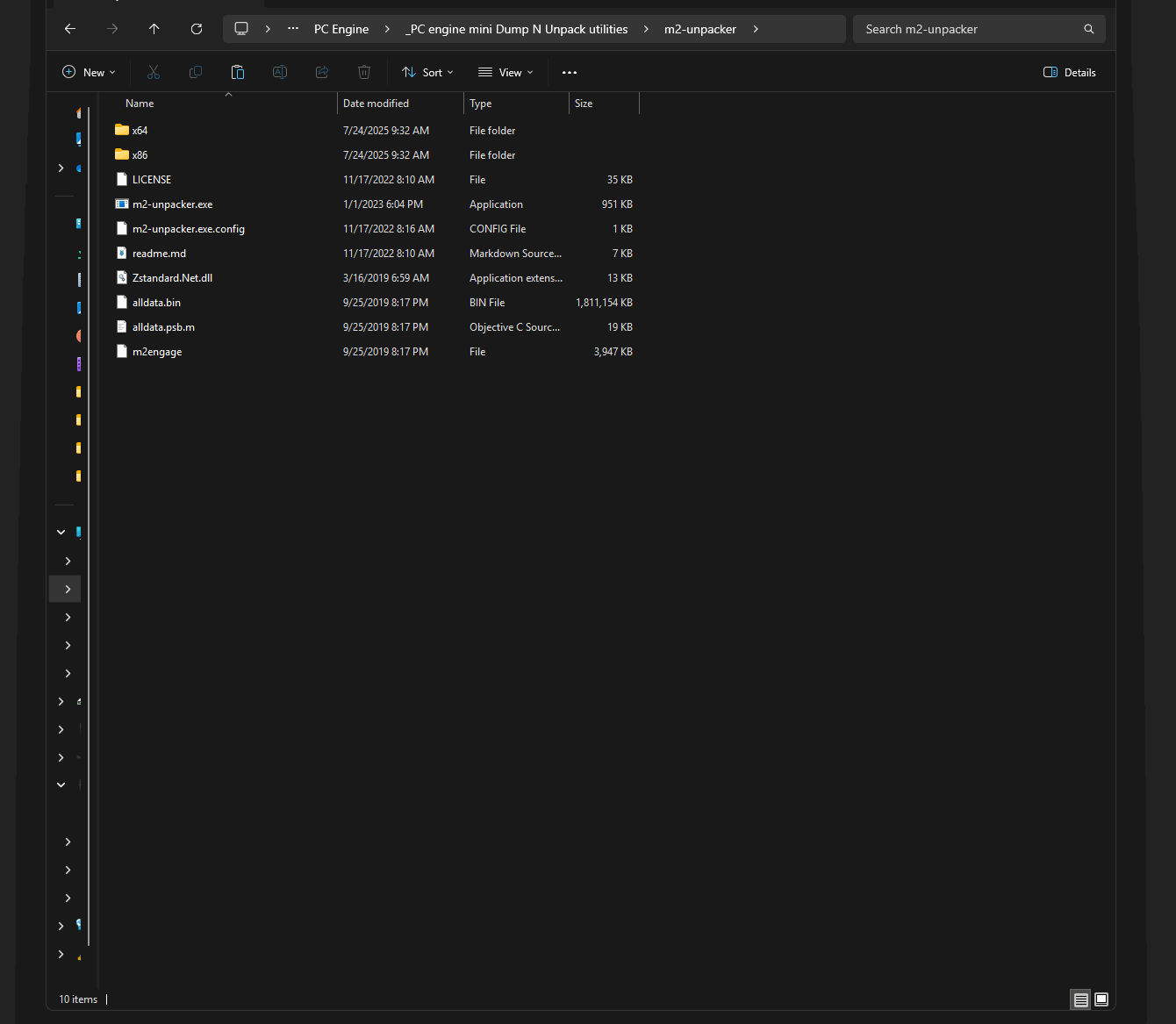 1. Descomprime m2-unpaker, trae los archivos alldata.bin, alldata.psb.m, and m2engage al mismo directorio.
