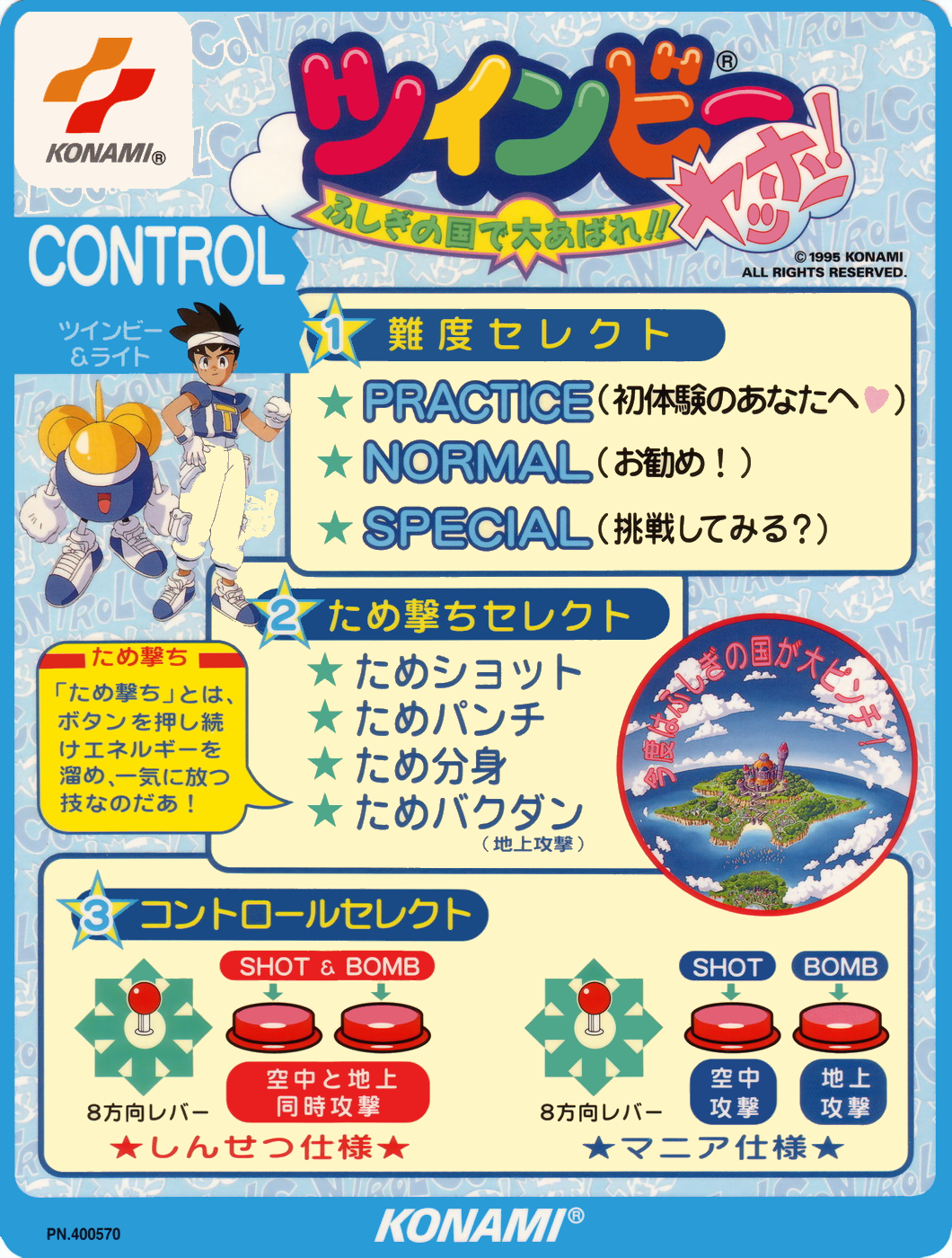 Ahora les propongo otro excelente cute shooter vertical para dos jugadores simultáneos desarrollado y publicado por Konami en 1995 para su GX system; es la tercera y última entrega de la saga Twinbee para arcade (Twinbee; Detana!! Twinbee y Twinbee Yahoo!); es un juegazo, las gráficas, la música, efectos de sonido y jugabilidad son maravillosos. Contamos únicamente con 2 botones además de nuestro joystick normal de ocho posiciones, con uno disparamos bombas hacia abajo y con otro nuestro disparo vertical normal; podemos escoger uno entre tres o cuatro super poderes que se cargan y liberan un ataque de gran magnitud (vg. los guantes de box, el ataque con fuego, etc).