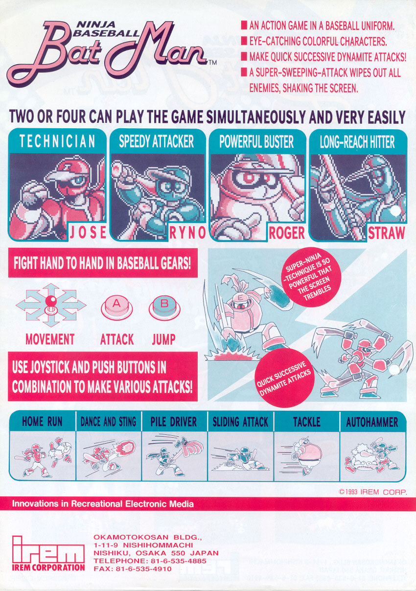 A continuación les propongo un colorido y estrafalario beat'em up para hasta cuatro jugadores desarrollado y publicado por irem en 1993; en él utilizamos nuestro joystick estandar de ocho posiciones y dos botones, golpear y saltar; en él podemos controlar a cuatro robot-ninjas beisboleros (Captain José -rojo-, Twinbats Ryno -verde-, Beanball Roger -amarillo-, Stick Straw -azul-) que se diferencian en aspecto, color y habilidades; los personajes están tan bien balanceados que hacen de cada partida algo totalmente distinto. El ninja rojo, es el más equilibrado, el verde, el más rápido, el amarillo, el más fuerte, y el azul, cuyos ataques tienen el mayor alcance de los cuatro; cada personaje tiene sus propios ataques especiales y algo diferente en este juego se produce cuando la barra de energía de alguno de nuestros héroes alcanza el color rojo, puede realizar diferentes ataques especiales que con mayor cantidad de energía no está permitido, dicha habilidad se pierde si consumimos algún alimento para aumentar nuestra barra de energía.