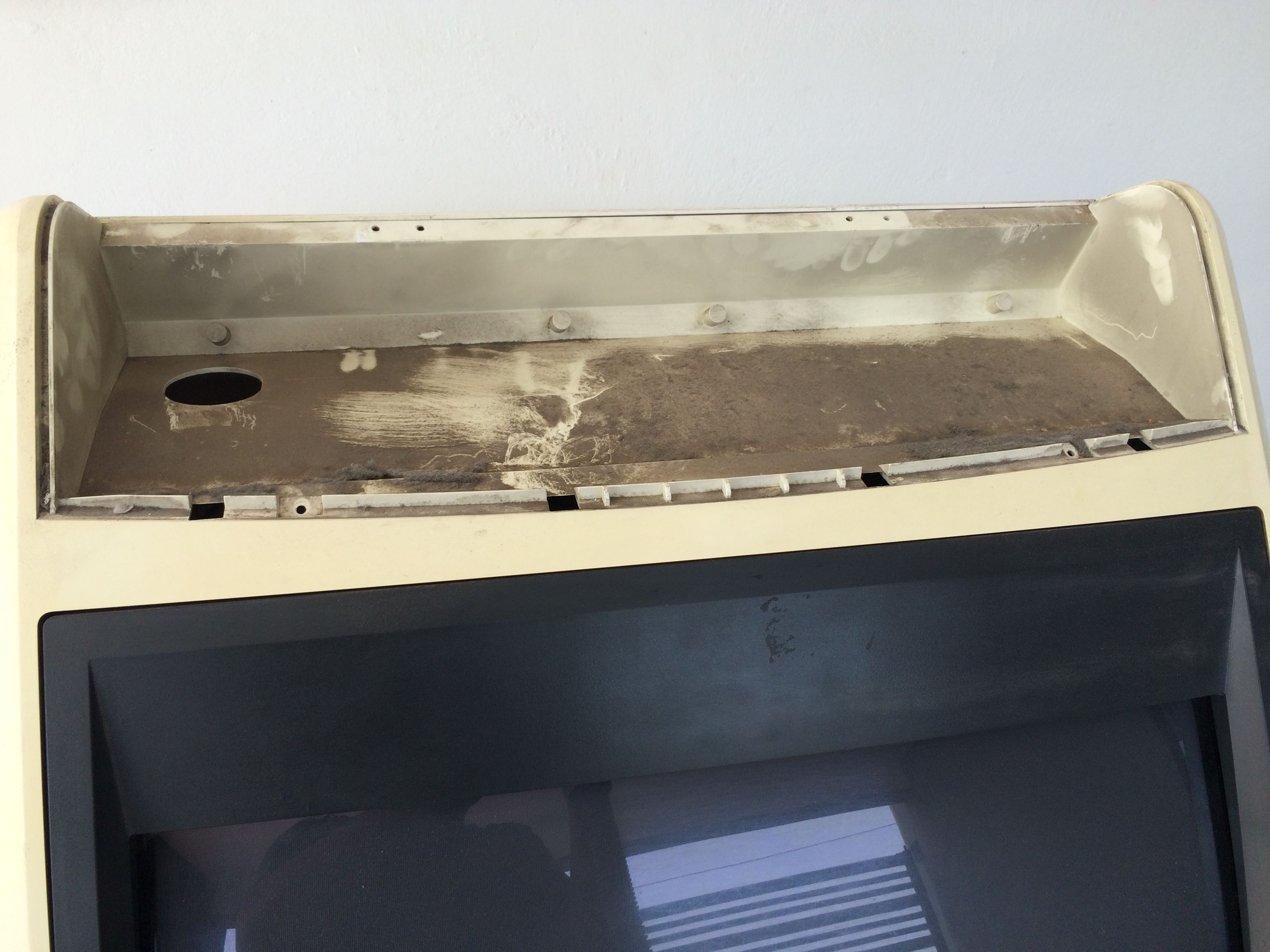 Si perdí los gráficos laterales del monitor y espero poder reemplazarlos con unas reproducciones, pero a la vez, se recuperó el color original del gabinete y se le taparon muchos detalles que traía por el uso de los años.