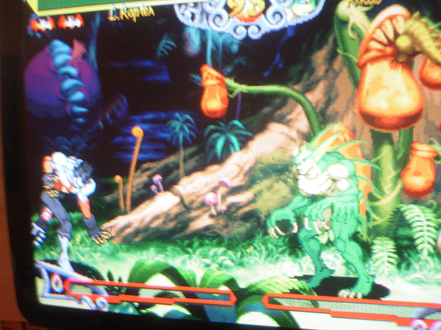 y aqui anexo una imagenes de vampire savior,la primera es como te digo,el fondo es rojo,y la barra de la esquina se deberia de ver rojo oscuro pero no tanto como se aprecia en la foto,y el personaje se ve de un tono azulado,como pueden ver en la foto 2,al pasar a este escenario el color ya se ve como se debe de ver,y asi me pasa en ciertos escenarios.