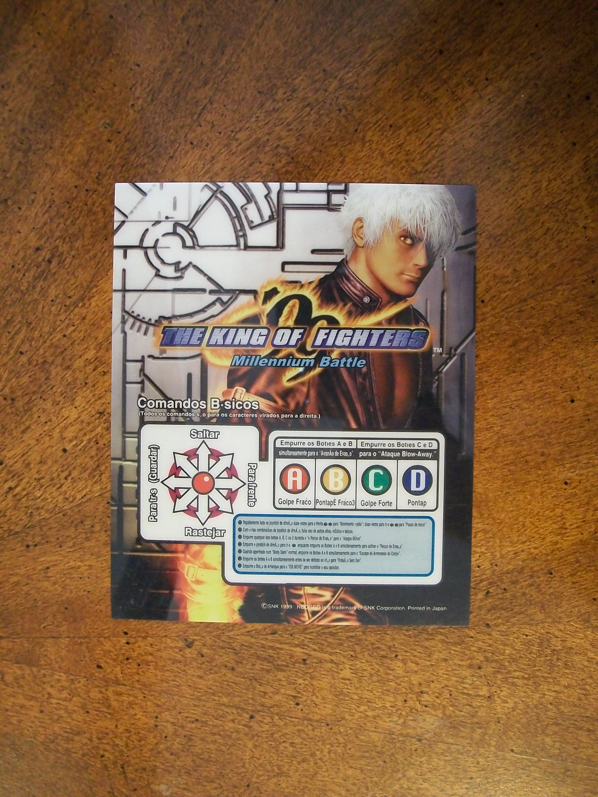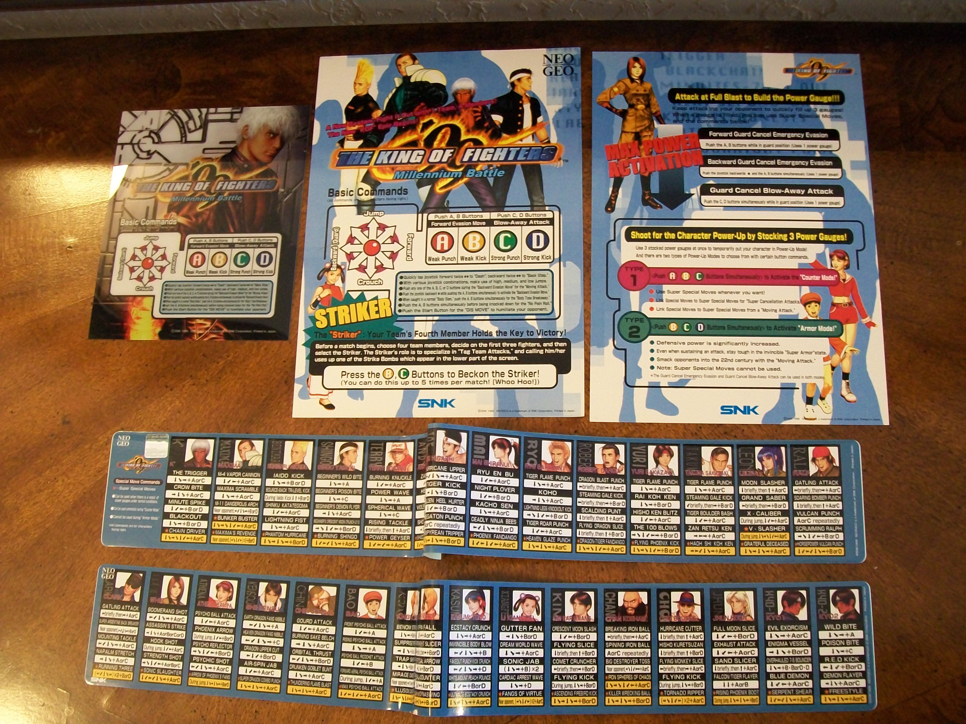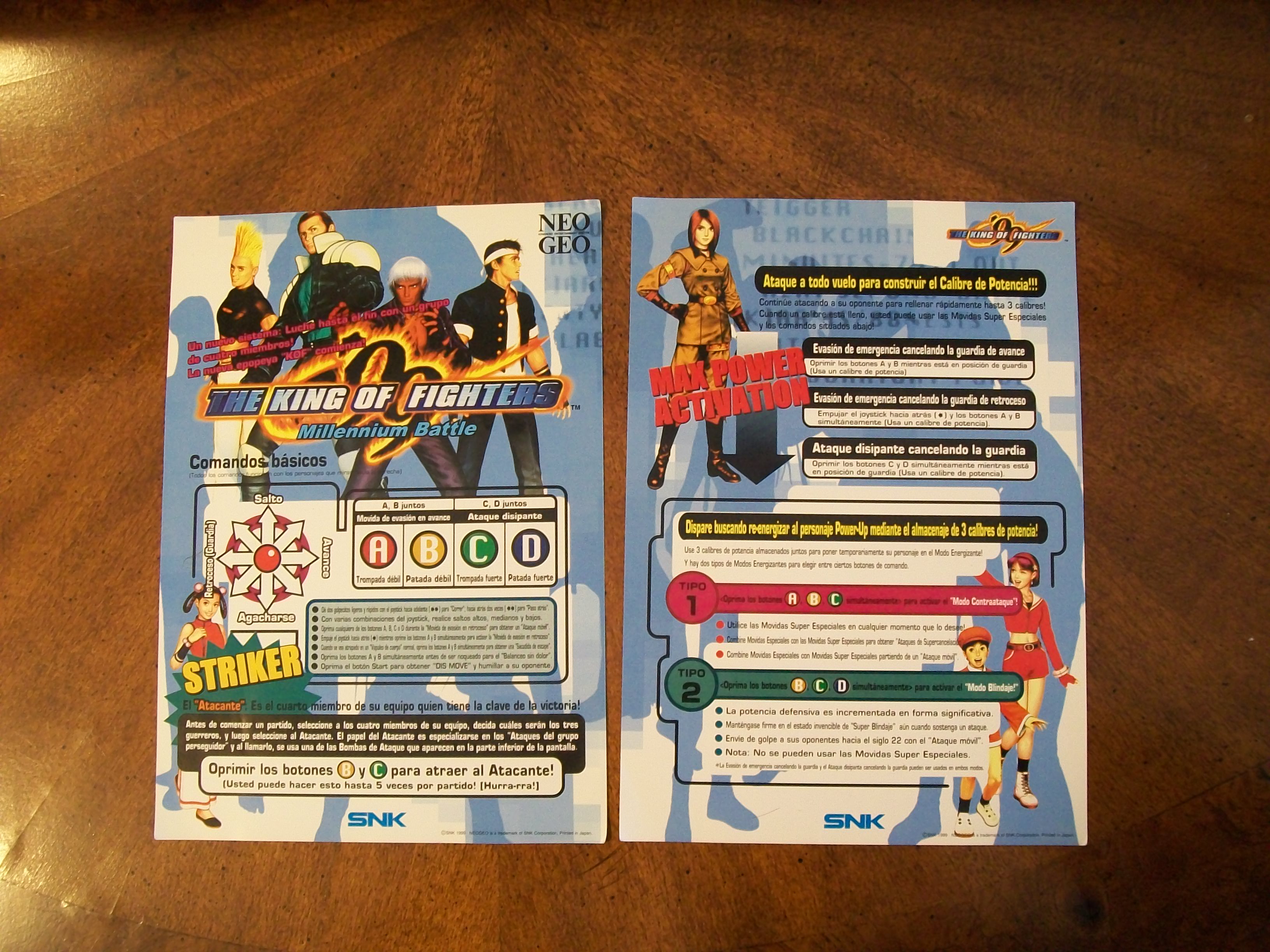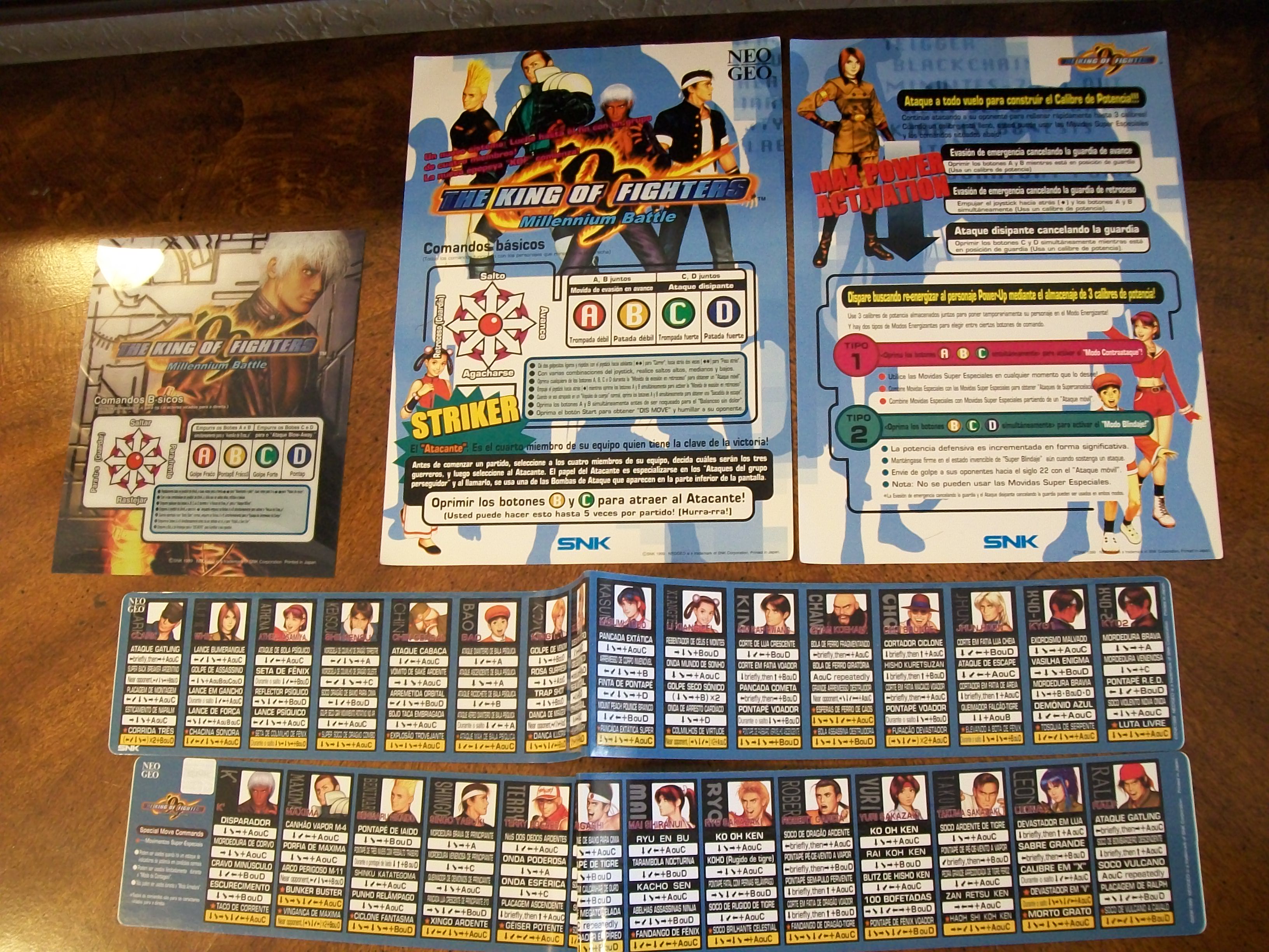 Hola otra vez, aqui les dejo unas fotos de algunas de las cosas que venian incluidas en el MVS de KOF 99, listas de movimientos y miniposters en español, Portugues e Ingles.