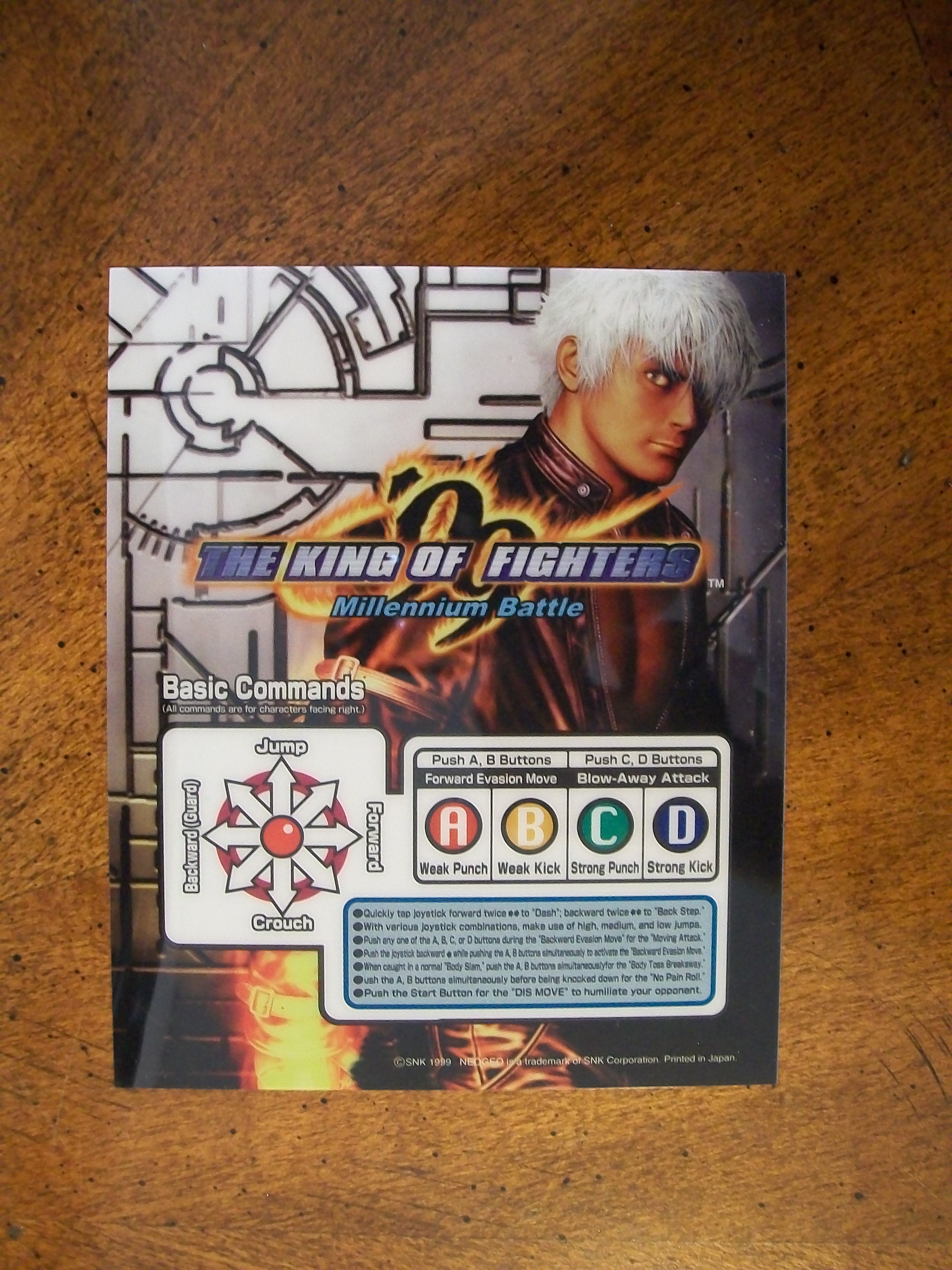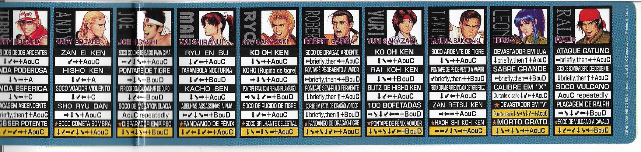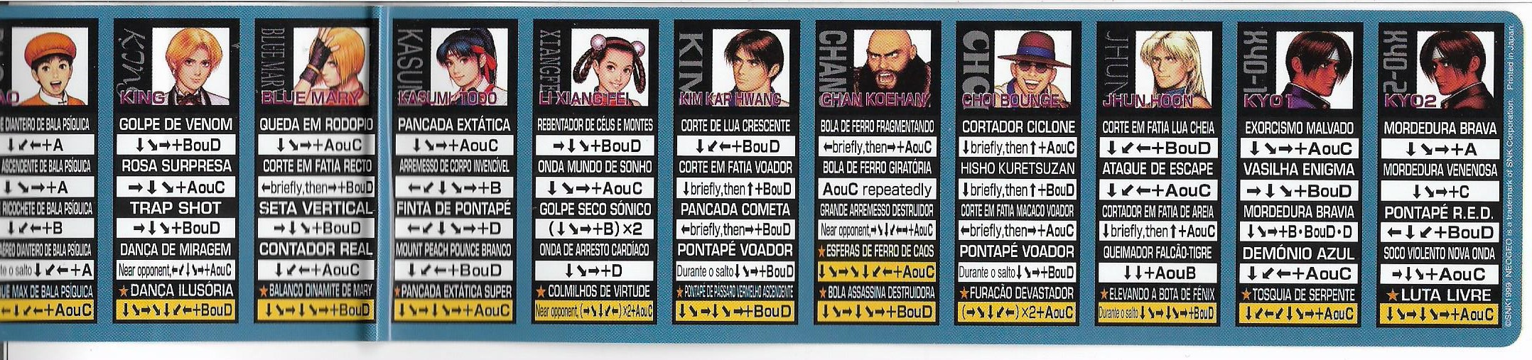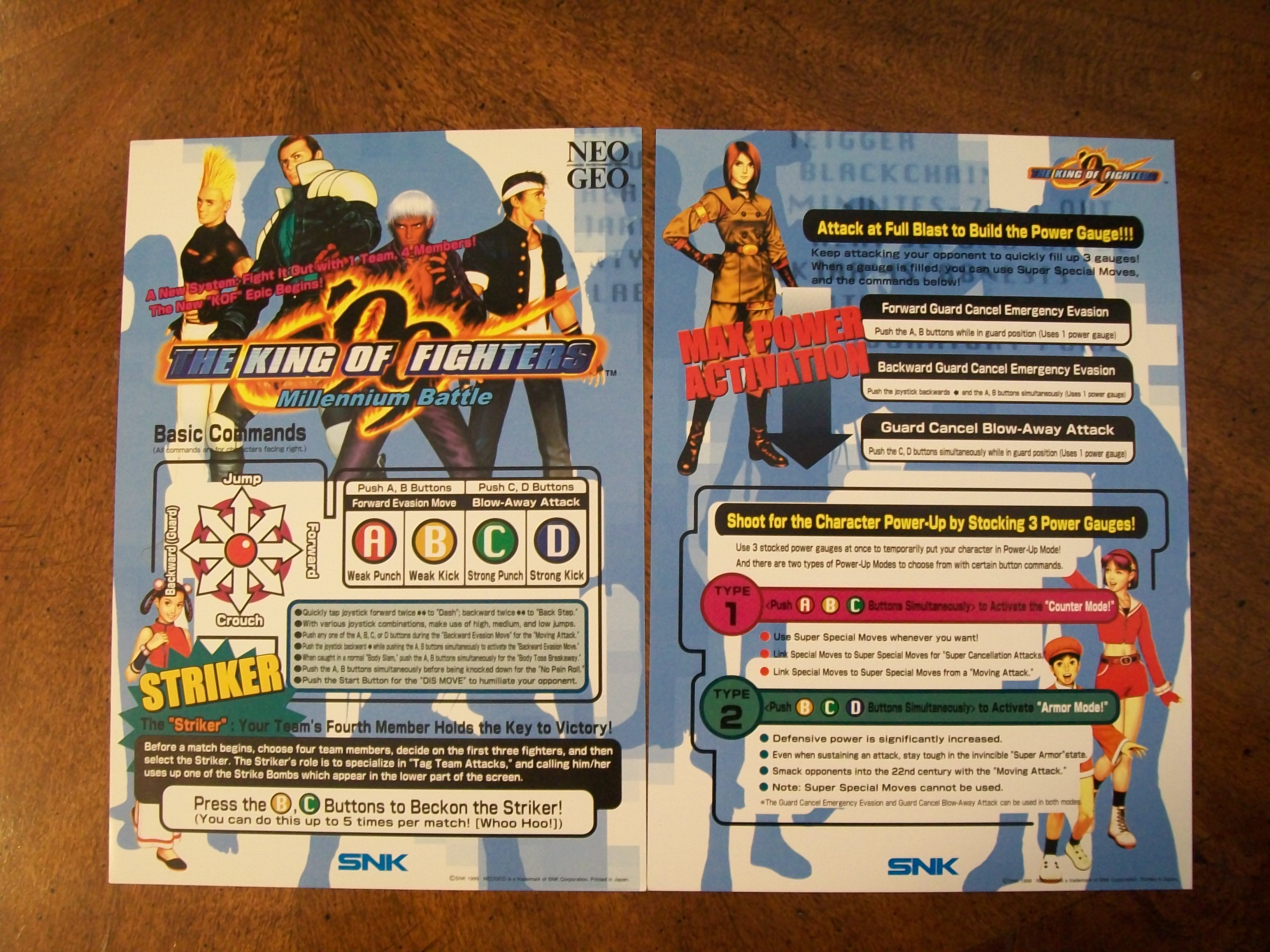 Hola otra vez, aqui les dejo unas fotos de algunas de las cosas que venian incluidas en el MVS de KOF 99, listas de movimientos y miniposters en español, Portugues e Ingles.