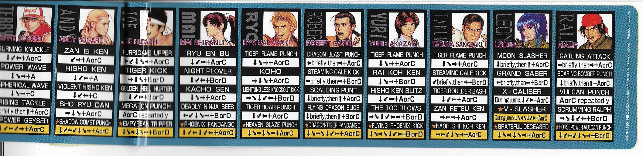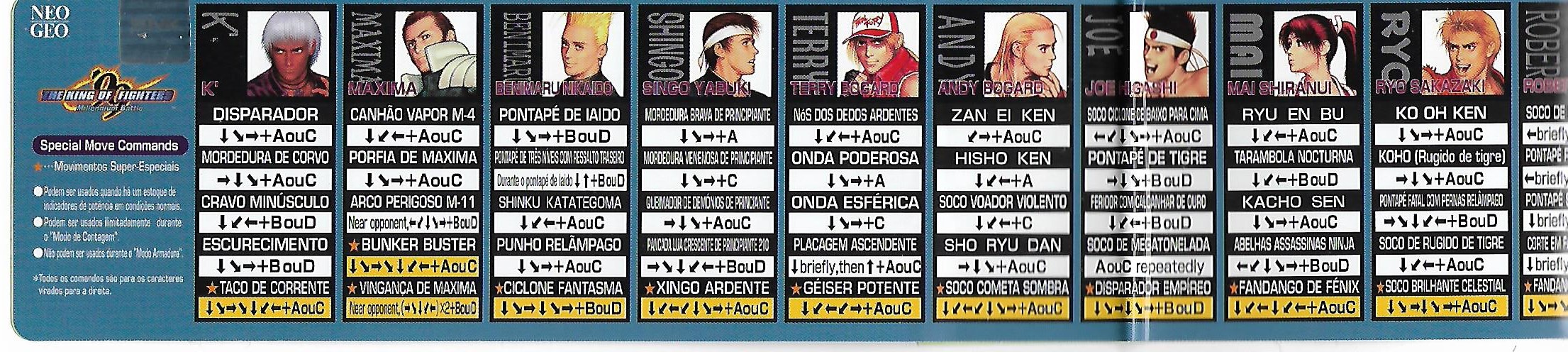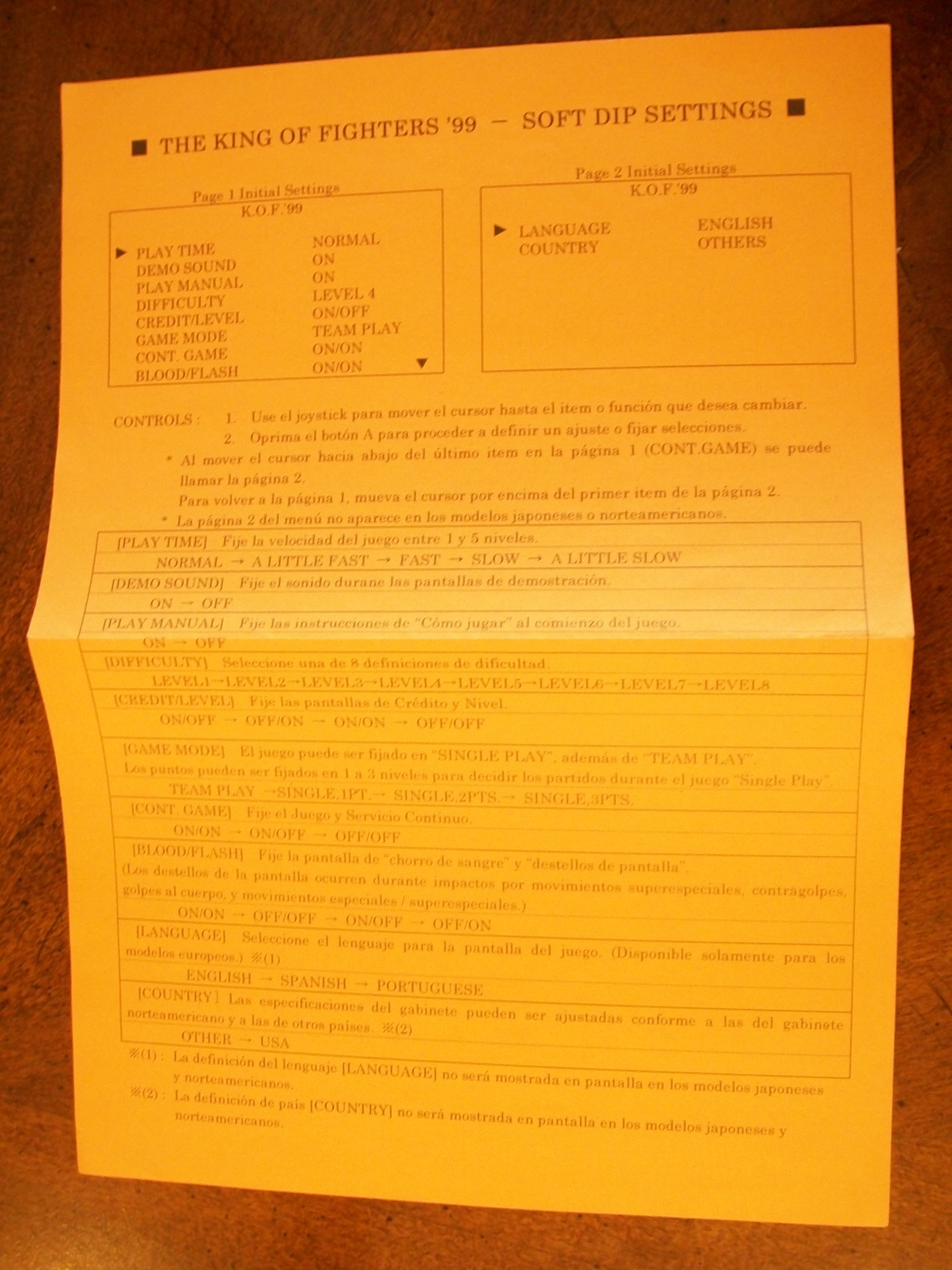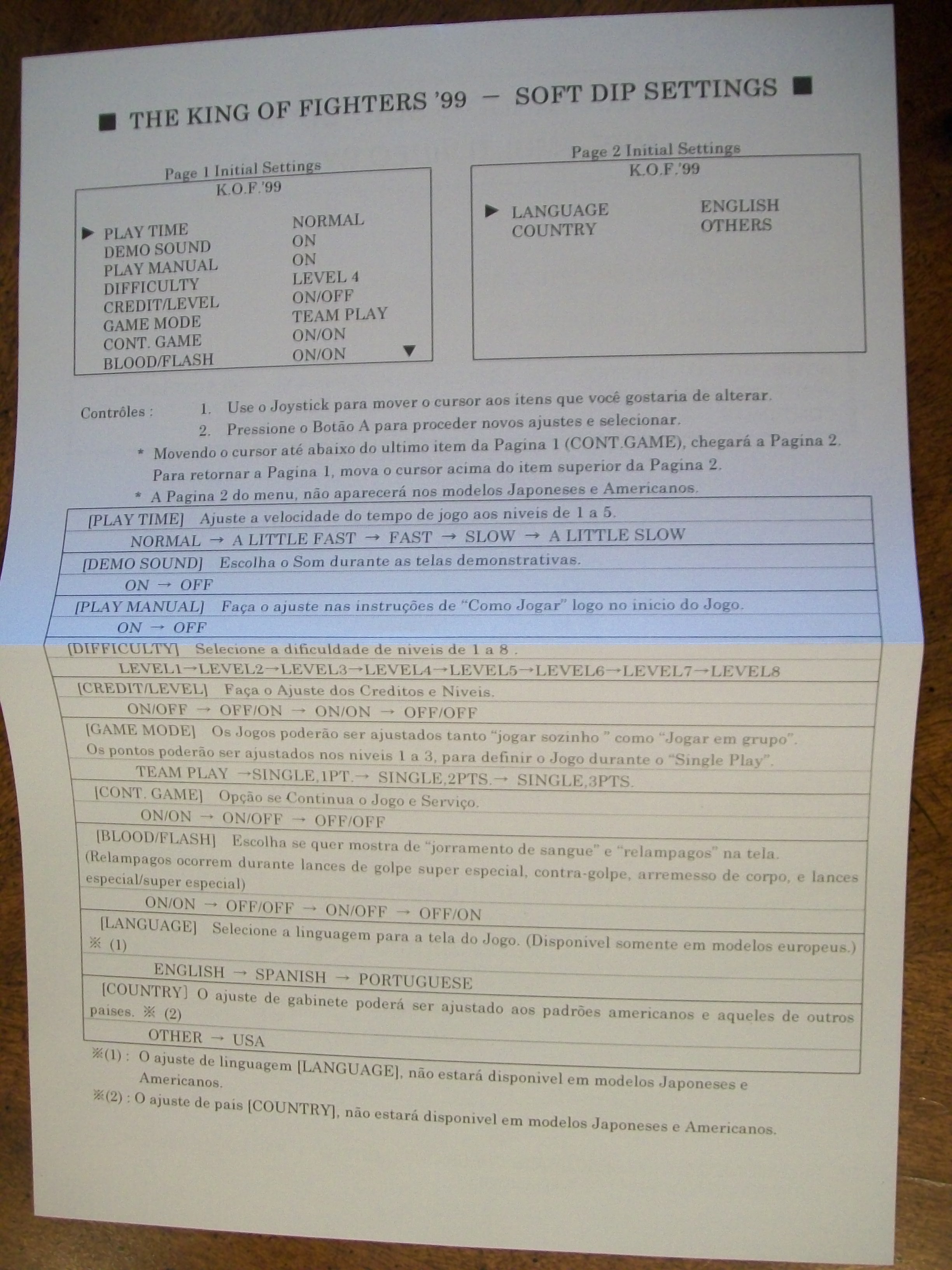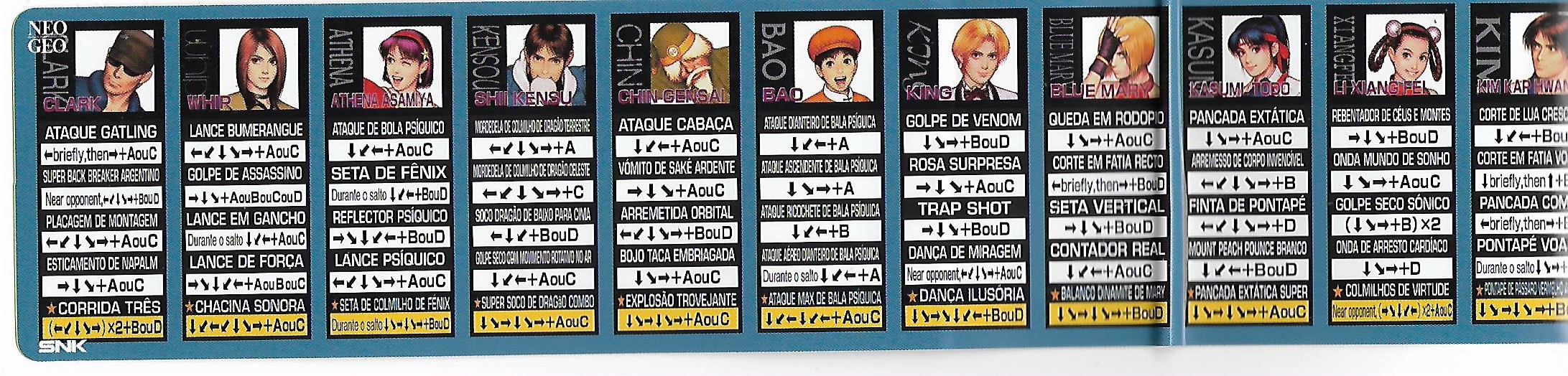 Hola otra vez, aqui les dejo unas fotos de algunas de las cosas que venian incluidas en el MVS de KOF 99, listas de movimientos y miniposters en español, Portugues e Ingles.