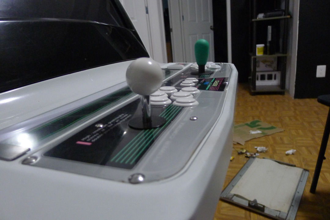 Al final decidí reusar los tornillos que tenían las palancas anteriores ya que no había nada que hacer para reparar el arte y no se ven fuera de lugar, use 8 botones sanwa que tenia de repuesto para mi arcade stick y use otros blancos nacionales para rellenar el segundo mando.