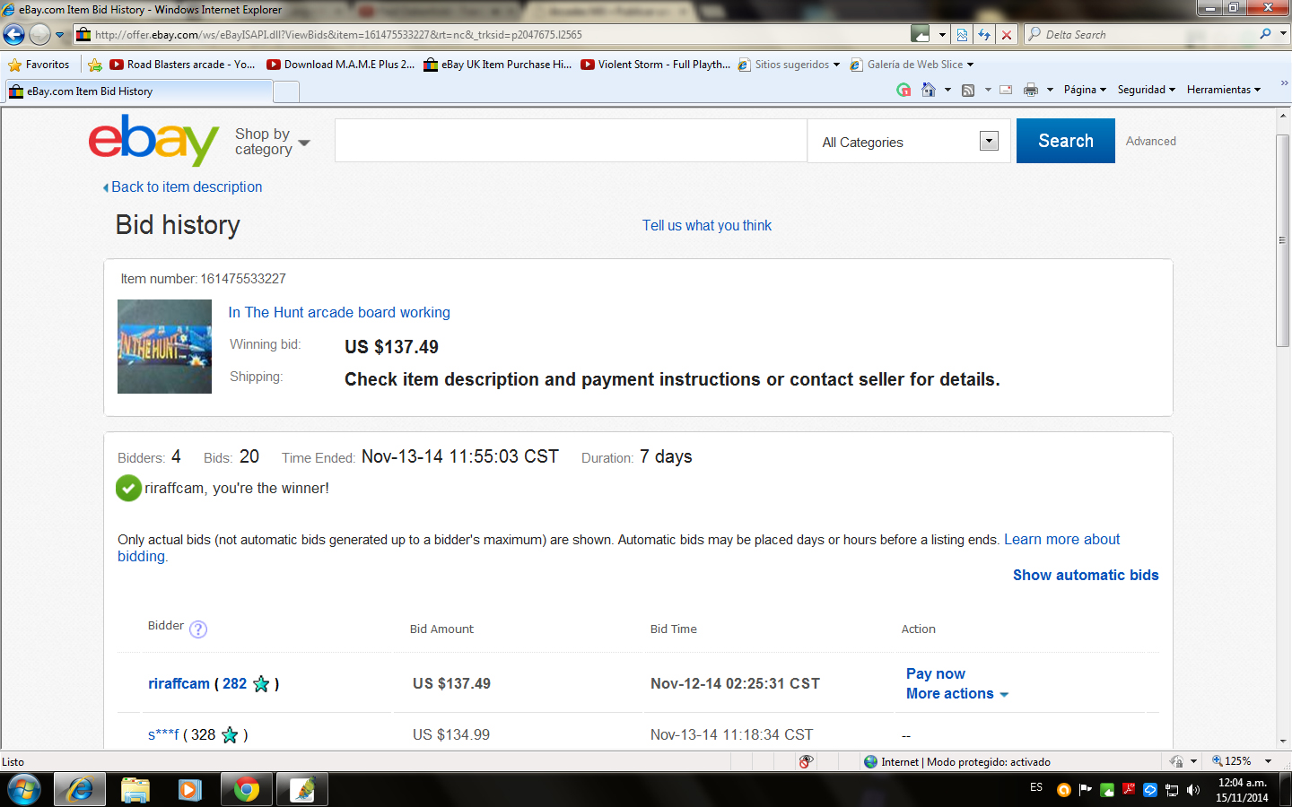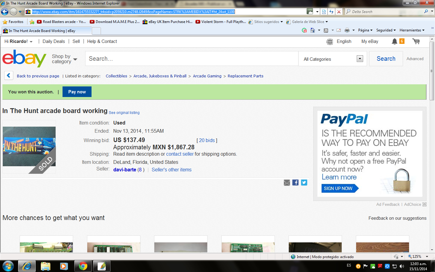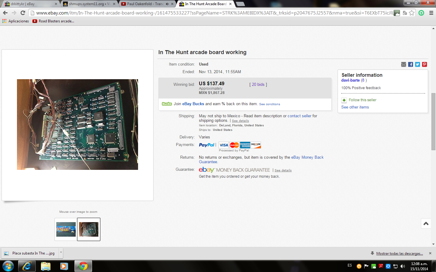 Como veo que se perdió el interés en el thread y me dejaron como dedo :P ; les aclaro que no participé en la subasta de la placa coreana en cuestión ya que yo participé en otra subasta por otra placa In The Hunt japonesa ubicada en Estados Unidos (así que ahora les presumo :D y les dejo el link de la subasta que gané junto con una impresión de pantalla para corroborar lo que digo); simplemente estoy tratando de ayudar a alguien y de paso obtener info por si se nos cruza algún buen juego de Irem en su edición M92 coreana (aunque por desgracia la venta de la placa koreana fue cancelada porque la respuesta de System 11 llegó un poco tarde; así que seguramente esa placa será ofertada nuevamente en ebay por si alguien está interesado).