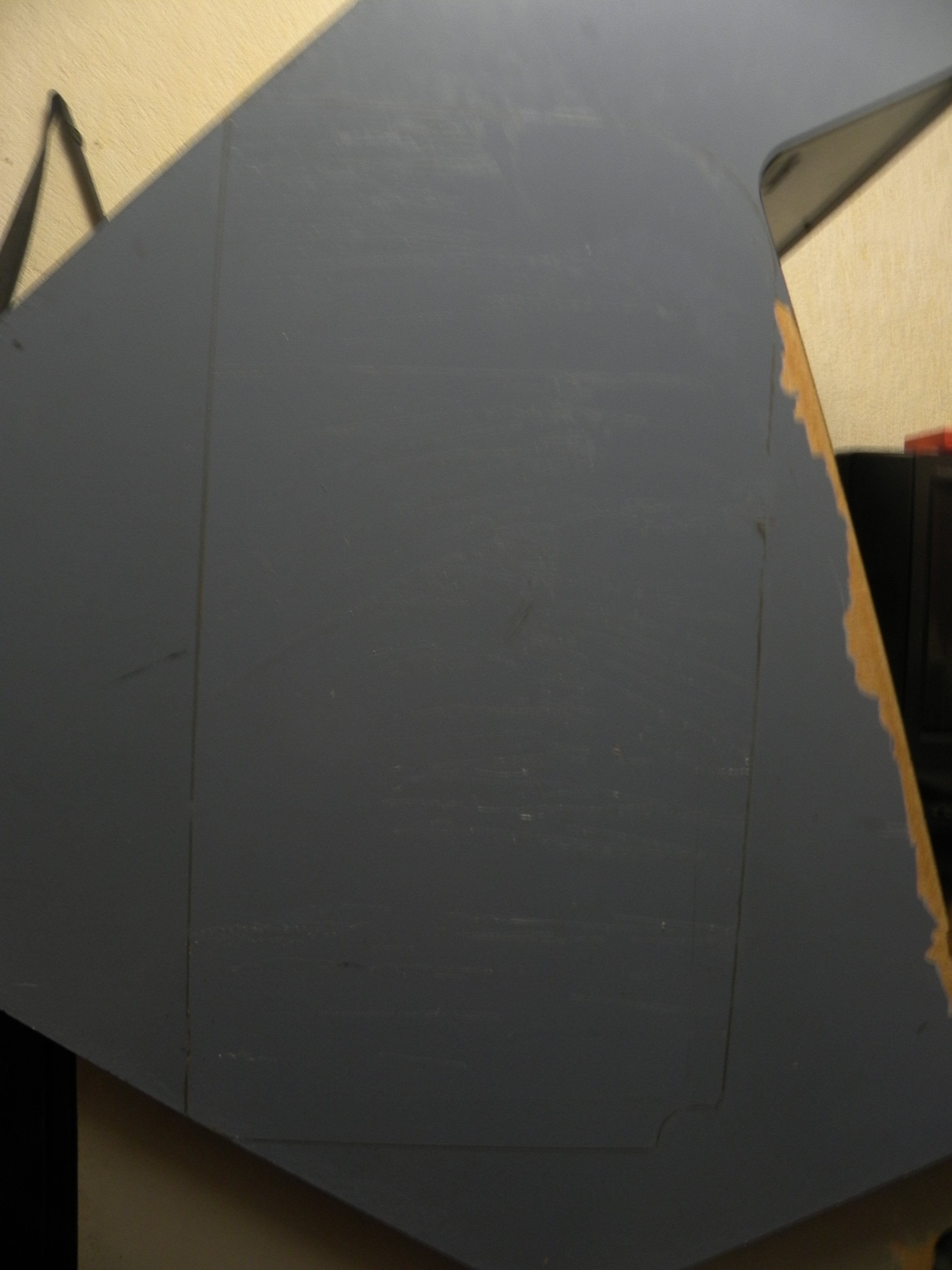 Como pueden ver la madera tiene humedad, y está áspera, lo que hice después fue emparejar con resistol blanco, y después le pegué el nuevo vinil de color gris, pero si les he de ser sincero, no me gustó mucho el resultado, aun voy a considerar la idea de mejorarlo un poco, les dejo un par de imágenes de como quedo.