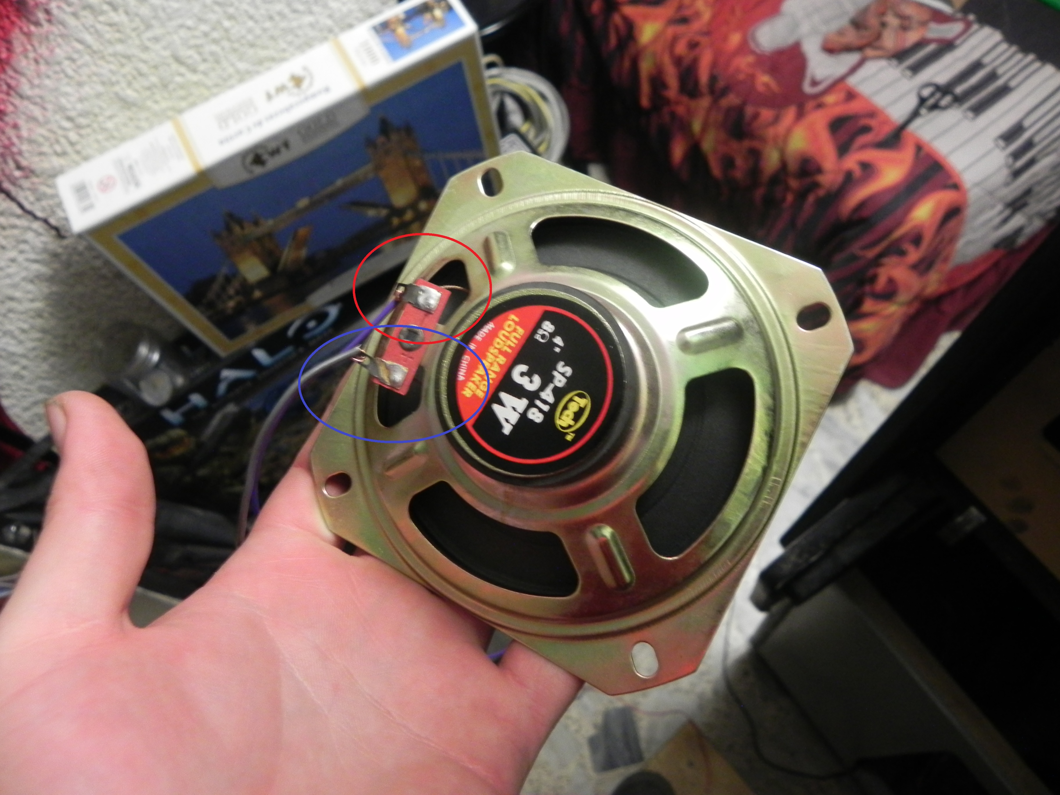 Con respecto a lo de las bocinas, había leído lo que me dices en la wiki, pero no pensé que fuera un problema conectarlas, como son dos cables de audio en el conector jamma, conecté uno y uno como puedes ver en la imagen, solo que del circulo rojo conecte el mismo cable en ambas bocinas y luego a uno de los dos cables de jamma, para el circulo azul hice lo mismo. Los dos cables de audio que salen de jamma nunca los junté. Si no me explico bien puedo tomar fotos de lo que me digas, para aclarar y al mismo tiempo para evitar descomponer algo. Espero no estar haciendo algo mal.