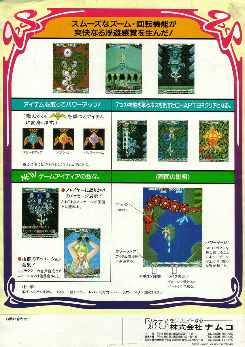 Continuando con shooters viejitos oscuros, ahora les presento a este excelente shooter vertical para un solo jugador (o dos alternado), desarrollado y publicado por Namco en 1988 únicamente en Japón; es un juegazo y es uno de los shooters más difíciles de ver incluso en ese país y por ende su precio es muy elevado cuando se deja ver; es todo un holy grail entre los coleccionistas más serios.