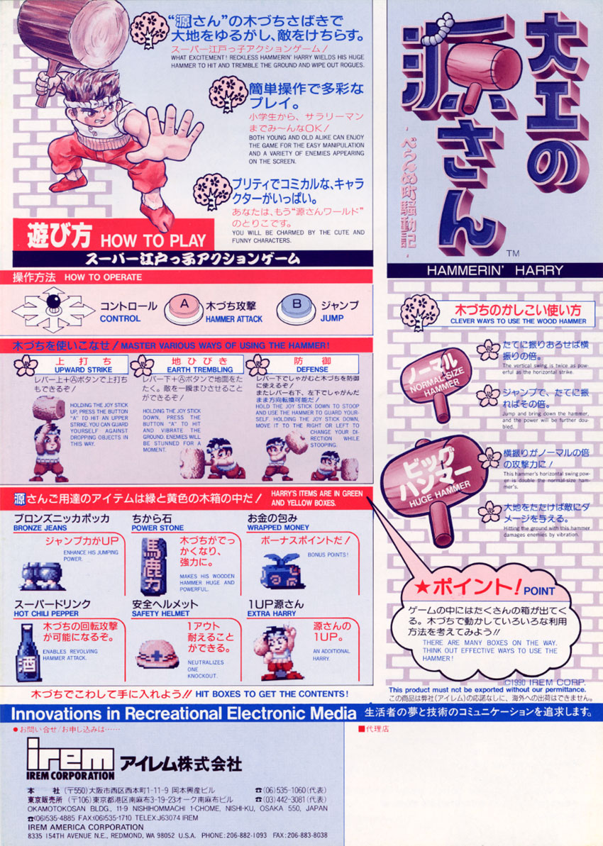 Para acabar con la mafia inmobiliaria nipona, contamos con nuestro joystick de ocho posiciones y dos botones, salto y golpe de martillo, pero un punto muy destacable que incluyó Irem en este gran juego, es que podemos hacer un golpe normal a una mano que nos hace blandir nuestro martillo de manera lateral y hacia arriba (el martillo no sólo sirve para atacar, sino también como escudo en todas direcciones, y podemos atacar repetidamente con él incluso durante nuestro salto), y otro golpe a dos manos que le imprime más poder a nuestro ataque (si presionamos el botón de golpe y la palanca del joystick hacia abajo al mismo tiempo, e incluso después de saltar para caer con el martillo e impactar fuerte el piso), y que hace que el impacto de nuestro martillo despida una onda de energía por el suelo para dañar a nuestros enemigos, o incluso puede hacer que pierdan el equilibrio si están en algún piso superior y, si lo hacemos repetidamente, podemos hacer que poco a poco vayan perdiendo el equilibrio hasta salir de la pantalla); también podemos usar el mazo para golpear objetos lanzándolos a nuestros enemigos. Hay mucha variedad de ataques con nuestro mazo de madera, incluso power ups que lo vuelven gigante para cubrirnos mejor y hacer mucho más daño con él, o si tomamos un chile de color rojo [sin albur] (en la versión japonesa es una botella de licor), podemos blandir más rápido el mazo y causar más destrucción.