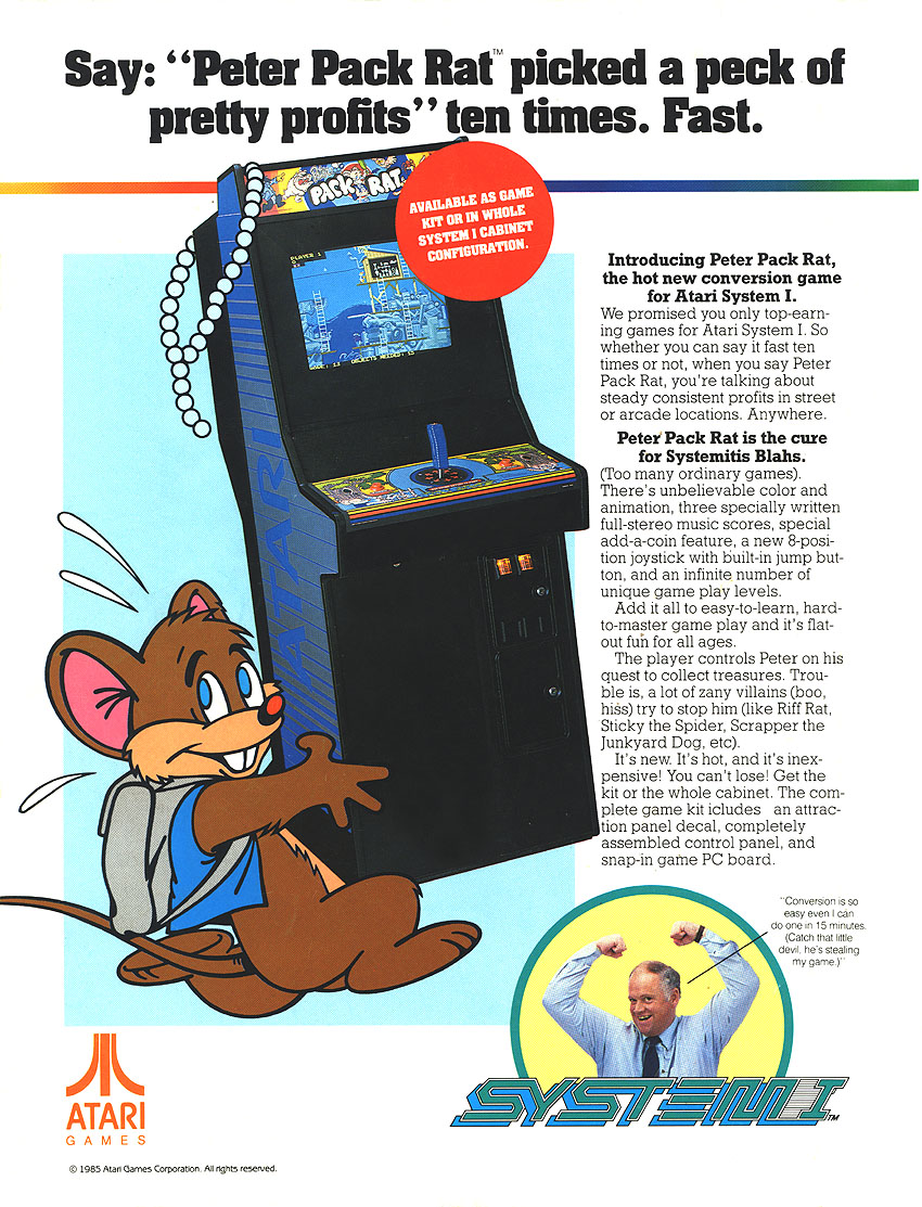 Hola a todos los miembros de ArcadeMX; hoy les propongo un juego que es toda una joya animada para su tiempo, se trata de Peter Pack Rat desarrollado en 1984/1985 por Atari Games (USA). Es un juego con un objetivo muy sencillo en el que nuestro personaje Peter (una rata acumuladora como varios de los miembros de este foro; aclaro, no por lo de rata sino por acumuladora), tiene que recolectar varios objetos para llevarlos a su madriguera e incluirlos en su colección; pero como todo en la vida, para poder lograr su objetivo debe eludir a varios personajes que intentarán impedírselo ("The Gang", integrada por Riff Rat y las ratas de Flatbush, el gato Clawd, Scrapper el bulldog, la araña Sticky, Slugger el murciélago, Big Al el cocodrilo, Diamond Jim la serpiente y Nite el buho; la mosca también es parte de la banda pero no aparece su nombre en el flyer del juego).