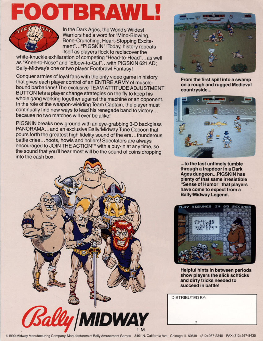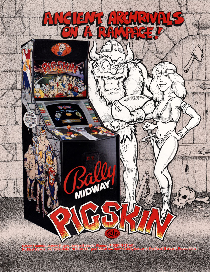 Hola amigos de arcadesmx, este día les propongo un divertidísimo juego desarrollado y publicado por Bally/Midway en 1990; se trata de Pigskin 621 A.D.; es un juego tipo futbol americado medieval de scroll lateral para dos jugadores; las gráficas, la música y los efectos de sonido son excelentes, pero lo más destacable del juego (además de todos los detalles gráficos) es su jugabilidad, la verdad lo recomiendo muchísimo, es muy divertido aun si jugamos contra la máquina.