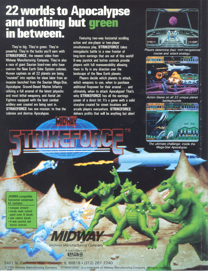 Hola a todos los miembros e invitados de ArcadesMX; hoy les propongo un shooter horizontal para dos jugadores simultáneos, desarrollado y publicado por Midway en 1991 (Midway Manufacturing Co. WMS); sin temor a equivocarme me atrevo a afirmar que éste es sin duda el mejor juego desarrollado por Midway (y que me perdonen los fans de la saga Mortal Kombat; bueno, no estoy contando a Discs of Tron ya que su gabinete es espectacular, pero creo que aun es mejor juego Strike Force), aunque desgraciadamente es obscuro debido a que en ese año comenzó el furor por los juegos de peleas, por el surgimiento de Street Fighter II; el juego tuvo poco impacto y por ende poca distribución en el mercado (casi nadie lo peló debido a que todos estaban clavadísimos con Street Fighter II, entre ellos un servidor, y nadie le puso la debida atención a un juego aparentemente similar a Defender, un clásico pero algo viejito juego de arcade), aunado a que recibió críticas muy inmerecidas de algunas revistas de arcade en USA, debido a que se le considera la tercera parte de la saga de Defender (Defender, Stargate y Strike Force), y dijeron que era un refrito pero con algunas mejoras, y que preferían la jugabilidad del clásico Defender (Lo cual fue una tontería enorme por parte de sus críticos, porque si bien es cierto que es la tercera parte de esa saga, Defender y Stargate no tienen nada que hacer a lado de este auténtico juegasasazo, aun cuando son también grandes juegos).