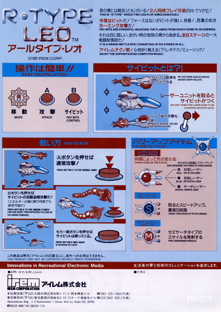 Este shooter de naves de scroll lateral para dos jugadores simultáneos, fue desarrollado y publicado por Irem en 1992; es la tercera parte de la saga de arcade de R-Type (R-Type, R-Type 2 y R-Type Leo), aunque es la precuela de toda la serie y el cuarto juego de ésta (incluyendo los juegos que no son de arcade como Super R-Type). Es un gran juego conocido por la mayoría de los miembros e invitados de ArcadesMx, pero seguro es desconocido para los que comienzan en esto del arcade y en el género de los shooters; los gráficos y música son excelentes como todo R-Type, no obstante que a diferencia de sus predecesores no utiliza la cápsula Force adelante de la nave, ni el Wave Cannon, ahora introduce a los Psy Bits, que son dos pequeñas cápsulas que se pueden aventar para atacar como la Force, pero van una arriba y otra abajo de nuestra nave y pueden disparar hacia adelante y hacia atrás.