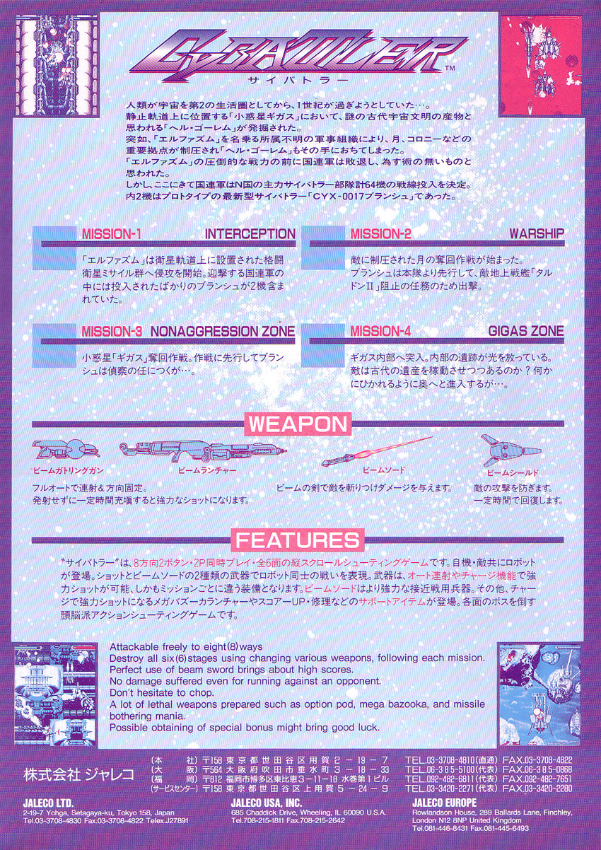 Continuando con la inercia de los shooters en el thread, les propongo una maravilla de hack n' slash/shooter vertical para dos jugadores simultáneos desarrollado y publicado por Jaleco en 1993. En este juegazo controlamos a nuestro mecha (azul o rojo) y sólo tenemos una vida que se distribuye a lo largo de la única barra de energía de la que disponemos, si se nos acaba la barra = game over sin opción para continuar a menos de que el otro jugador esté todavía en acción; podemos usar nuestra espada laser para destruir a los mechas y naves enemigas, o dispararles desde ocho posiciones distintas; conforme avanzamos de nivel se incrementan las armas de nuestro arsenal hasta 5 (espada laser, nuestro cañón de plasma de uno y dos disparos, misiles y nuestro escudo), además de algunas armas que podemos usar momentáneamente cuando aparecen flotando en la pantalla.