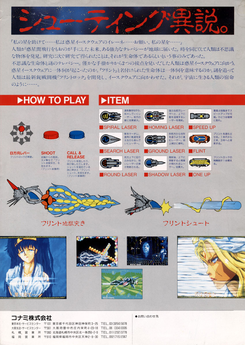 Siguiendo con grandes shooters poco conocidos, les propongo a este juegazo horizontal para dos jugadores simultáneos desarrollado y publicado por Konami en 1991; se le considera un hack de R-Type pero la verdad no le pide absolutamente nada, sobre todo porque el control de la cápsula que podemos lanzar (denominada "The Flint") es más complejo, y su ataque es de gran magnitud debido a los brazos que puede desplegar, lo que nos permite posicionarla en la pantalla a voluntad para bloquear ataques o causar más daño a los jefes de cada nivel; los backgrounds del juego son impresionantes y la música excelente (sin duda es el mejor shooter de Konami).
