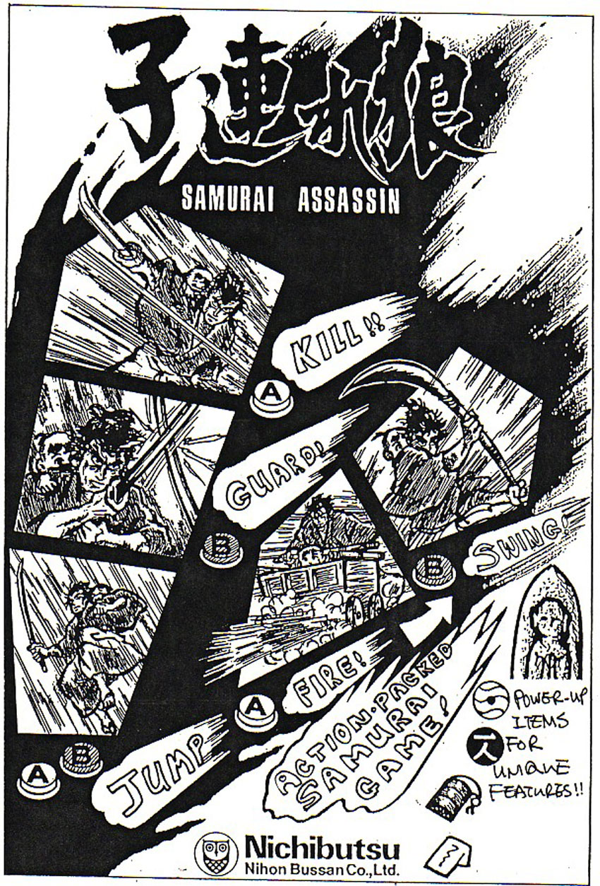 Ahora les presento un obscuro hack n' slash (yo díria que más bien sería run n' slash) de scroll lateral para un solo jugador (o dos alternando), desarrollado por Nihon Bussan en 1987 y publicado por Nichibutsu en ese mismo año; está basado en el famoso manga de los 70s del mismo nombre (traducido al inglés como Lone Wolf an Cub), en el que el poderoso y legendario guerrero Ogami Itto (nuestro personaje), quien es ejecutor del Shogun de Tokugawa (su brazo derecho, encargado de imponer la voluntad del Shogun a los señores feudales inferiores), es traicionado por los miembros del clan Yagyu, quienes levantaron falsas acusaciones en su contra diciendo que Ogami Itto deseaba y planeaba la muerte del Shogun, porque lo culpaba de la muerte de su esposa (el clan Yagyu asesinó a la esposa de Ogami Itto y a todos sus sirvientes cuando él no estaba en casa; el único sobreviviente del brutal ataque fue su hijo Daigorō de 3 años de edad), lo cual no era cierto. Itto es desterrado por el Shogun y se ve forzado a huir con su hijo de 3 años (a quien carga en la espalda todo el trayecto mientras él se defiende con la espada) mientras lo persiguen y tiene de cruzar por diferentes pueblos donde intentarán asesinarlos.