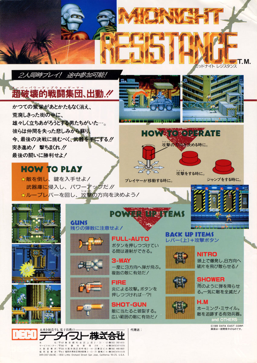 A continuación les presento este run n' gun/platformer de scroll lateral para dos jugadores simultáneos, desarrollado por Nihon Bussan/AV Japan en 1989, y publicado por Data East en ese mismo año; es la respuesta de Data East al Contra de Konami (y es una buena respuesta). El plot trata de que en un futuro distante un científico malvado se ha apoderado del mundo y ha secuestrado a mucha gente, así que nosotros vamos a ir a rescatar a nuestras familias que están en prisioneras en su fortaleza, con todo el arsenal que tenemos a nuestro alcance.