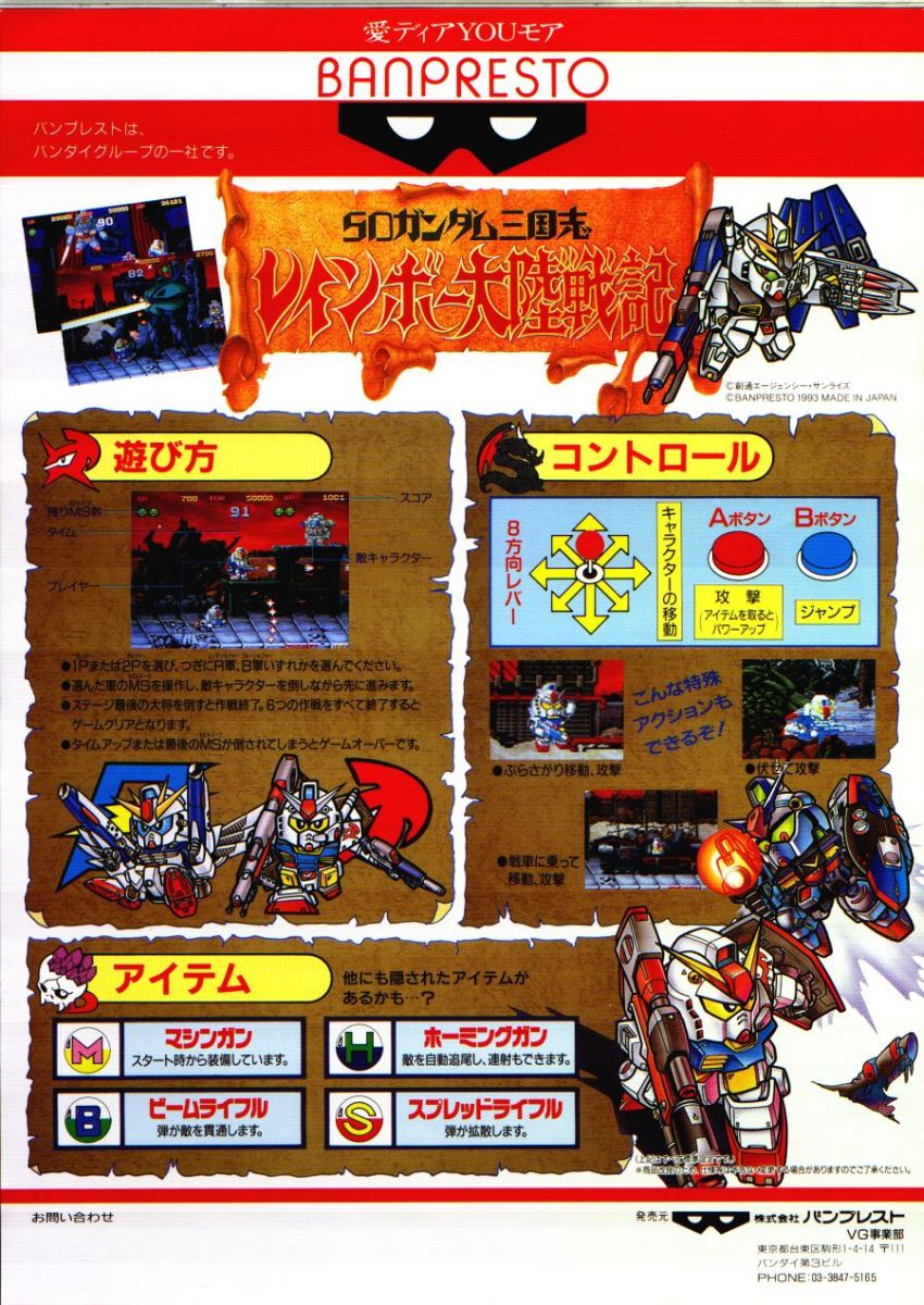 A continuación les presento un oscuro run n' gun/platformer desarrollado por Sotsu Agency-Sunrise en 1993 y publicado por Banpresto únicamente en Japón y Korea en ese mismo año; es tan obscuro que no está en el listado de KLOV (pero si tienen el flyer), ni emulado en MAME todavía, así que la única forma de jugarlo es con la placa jamma directamente. Consta de 6 niveles, cada uno con su respectivo jefe de final de fase.