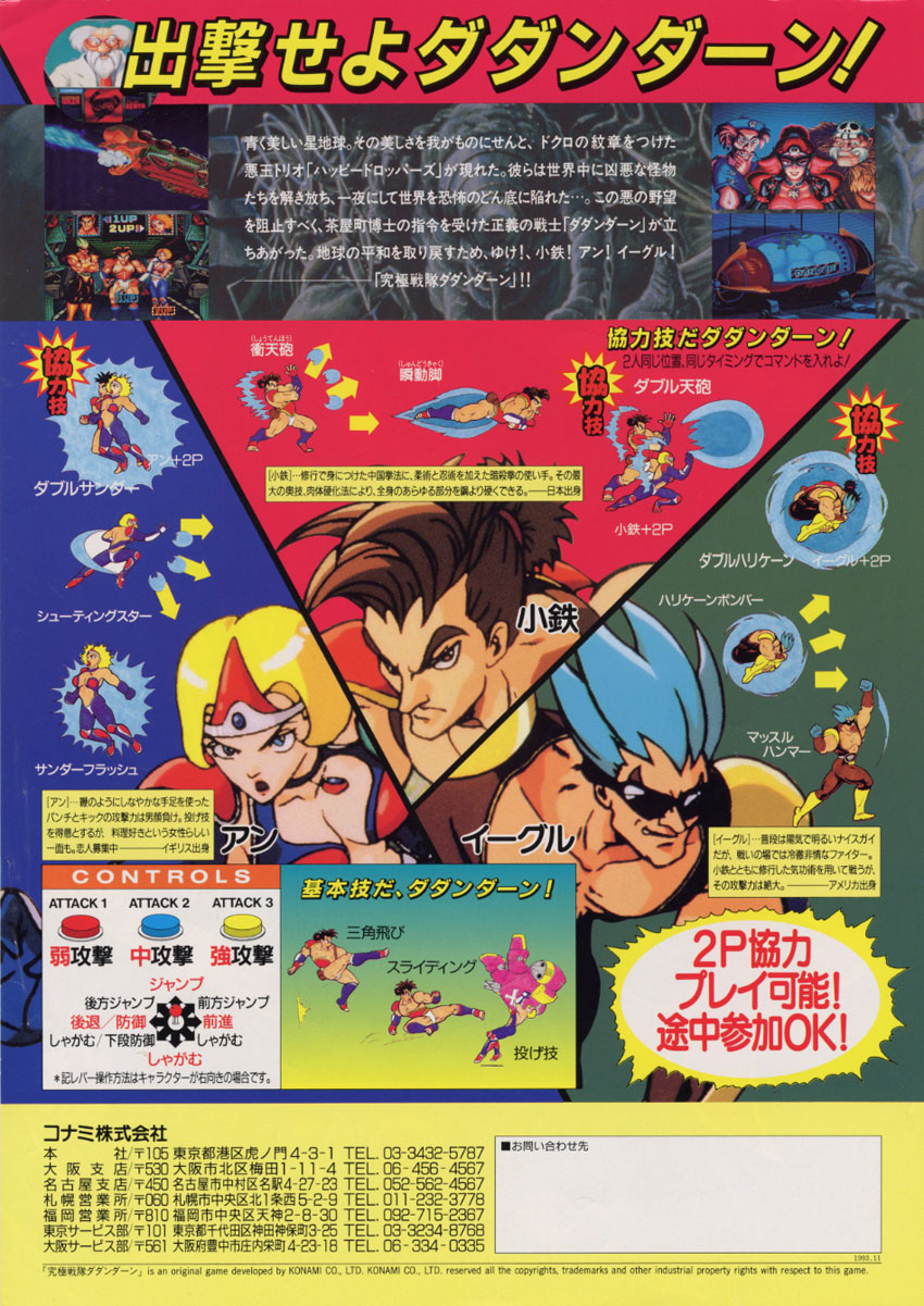Continuando con desconocidos pero grandiosos beat m' ups/peleas ahora les propongo este excelente exponente para dos jugadores simultáneos desarrollado y publicado por Konami en 1993; en él podemos enfrentar algunos jefes de otros juegos de Konami; si jugamos con algún compañero podemos hacer algunos ataques especiales conjuntos.