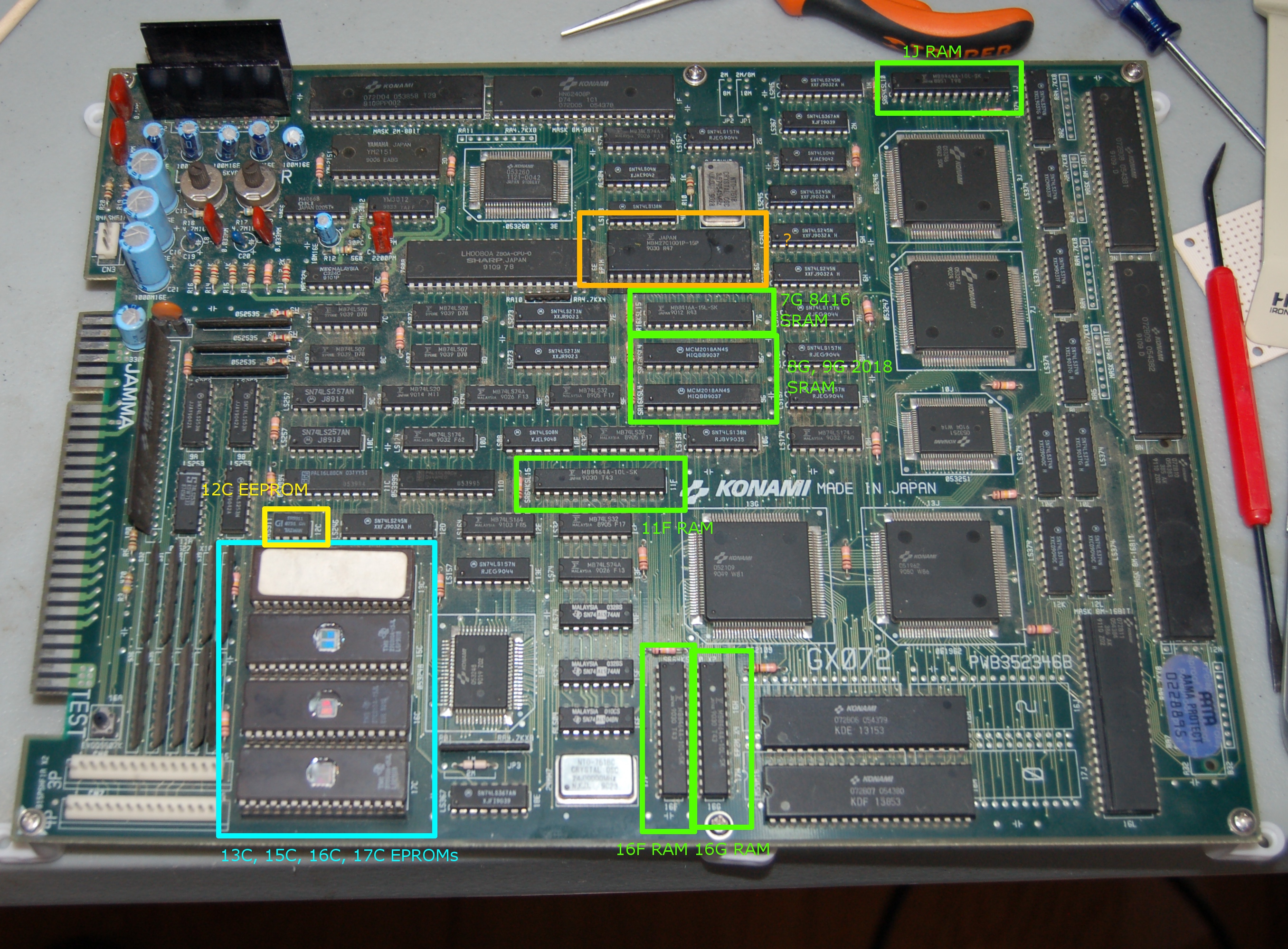 Ahora a aclarar unas cosas. En Simpsons la EEPROM que se arregla al bootear con el botón de test presionado es 12c, esto ya me ha sucedido en varias ocasiones. Por otra parte, la PCB que muestro en la foto es una que reparé, estaba dañada la RAM 1J. Compré un sustituto en ebay y la cambié, funcionando a la perfección, esto me llevó a pensar que podía ser algo similar... sin embargo el hecho de que muestre checksum a la derecha de la posición es indicativo de que se trata de una ROM y no una RAM.
