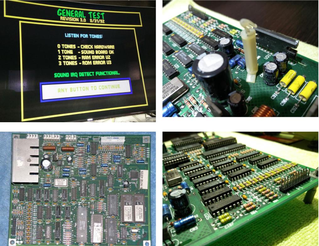• Al investigar sobre casos similares basasdo en experiencias de otros poseedores de PCB’s Mortal Kombat, NBA JAM o Terminator 2 entre otros juegos que utilizan la misma tarjeta de sonido; el problema parecía indicar mala alimentación en la tarjeta de sonido, una conexión incorrecta en el cable de datos, falla en el amplificador de sonido o algún capacitor dañado, los cuales parecen ser fallas comunes. Por lo que, cubiertos los dos primeros casos, la siguiente prueba que hice fue verificar que el amplificador de sonido MB3731 estuviera funcionando correctamente.