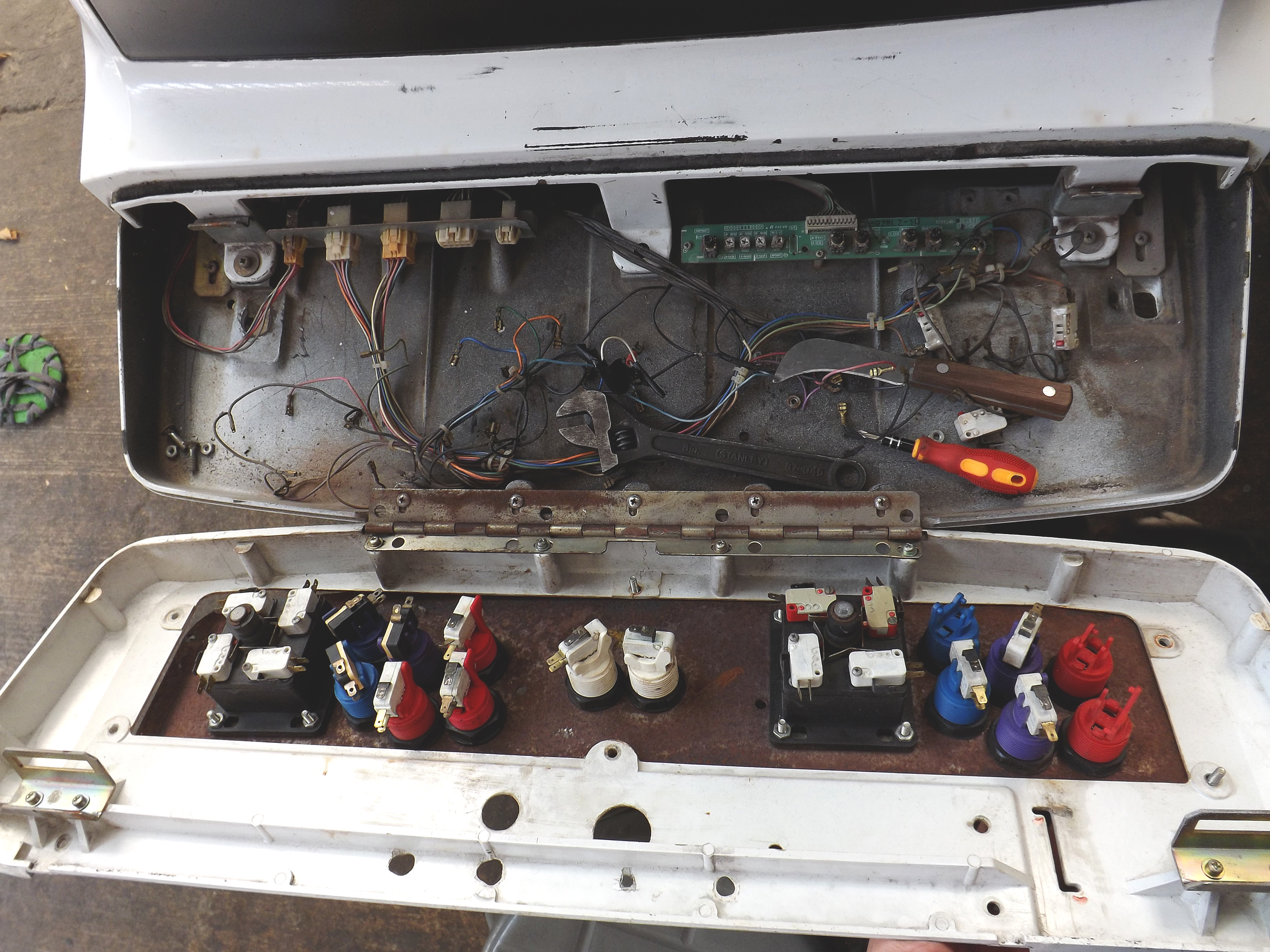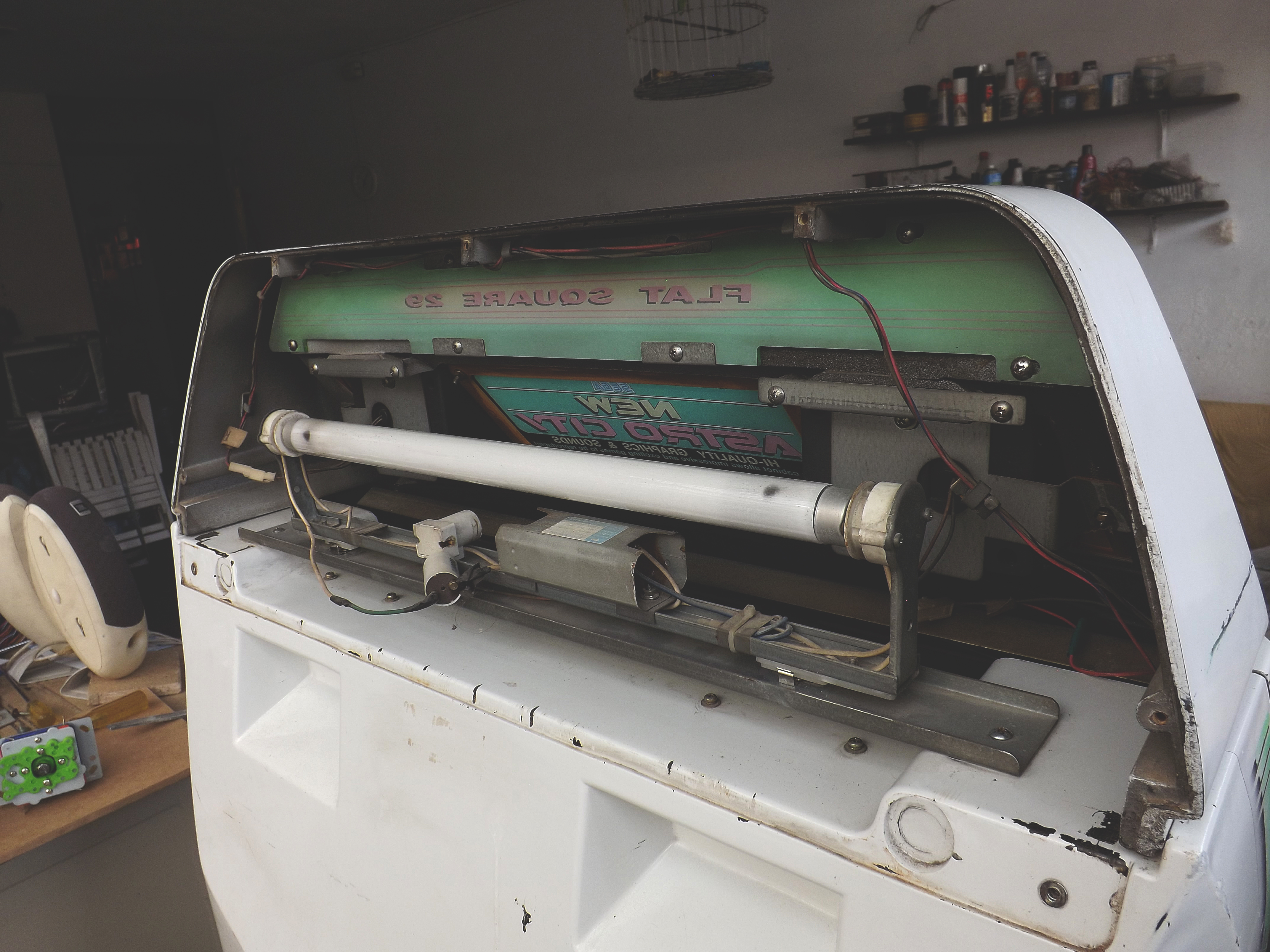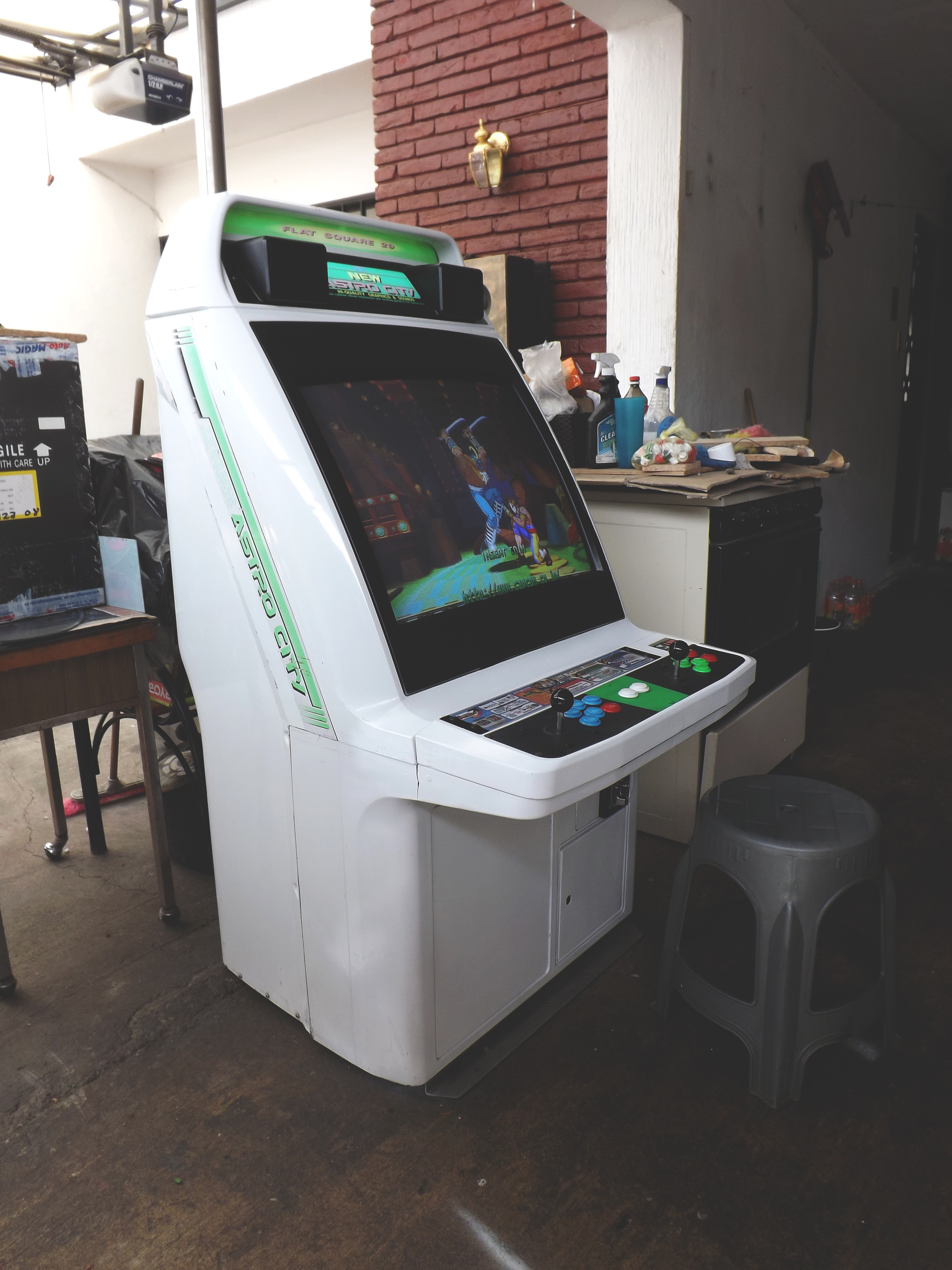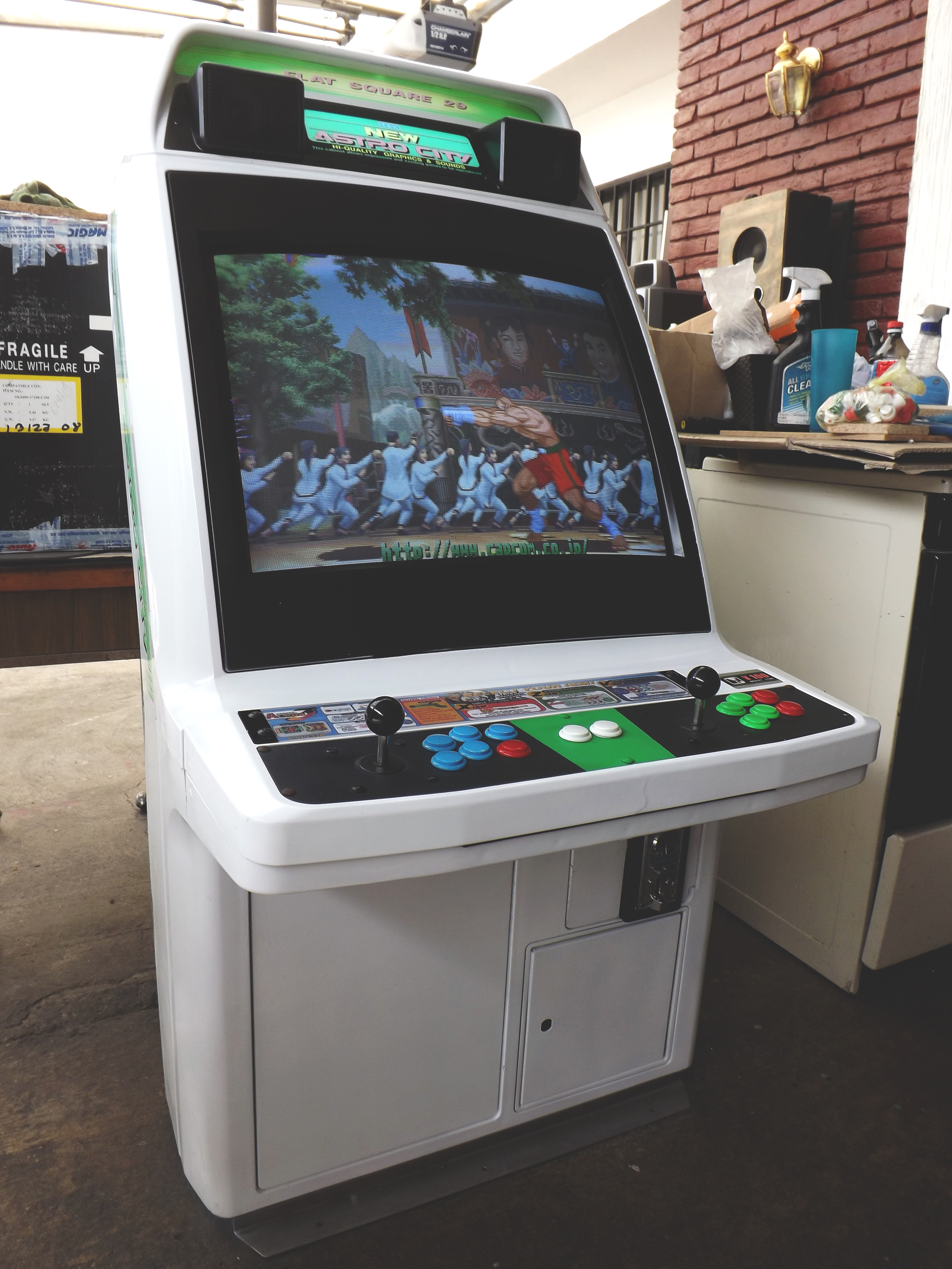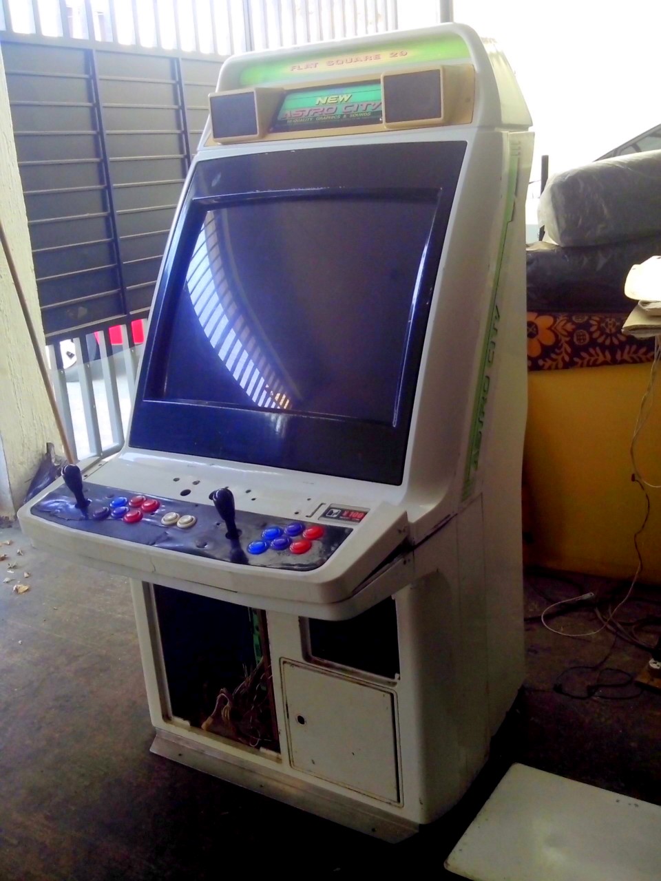 Gracias o todos los que aportan al sitio, sin ustedes no tendría esta maquina, la encontré en mercadolibre en las fotografias el monitor se veía magnetizado con dos manchas grandes, aun así decidí comprarla sabiendo que seria muy difícil encontrar un monitor de remplazo, negociando tuve suerte de obtenerla por 6000 con MvC jap de regalo y envío incluido ya que los precios están despegando, al probar la maquina descubri que el monitor ya no estaba magnetizado y los unicos defectos que tiene son una grieta en el tablero muy común en los astro city (que aun no reparo), rayas y manchas en el monitor que son casi imperceptibles en un cuarto obscuro, aun le faltan detalles como cambiar algunos botones, instalar chapas para los seguros del tablero o tornillos nuevos.
