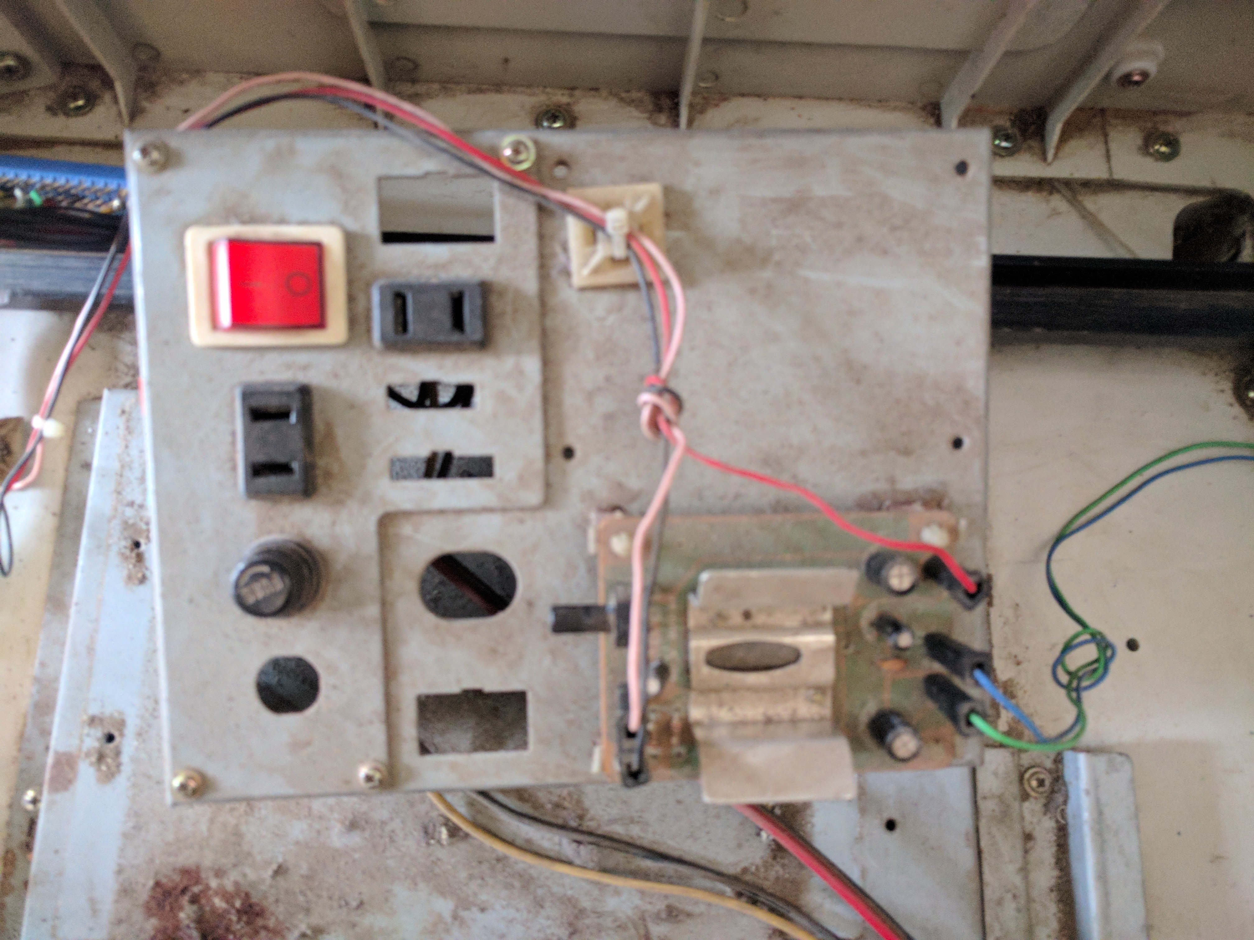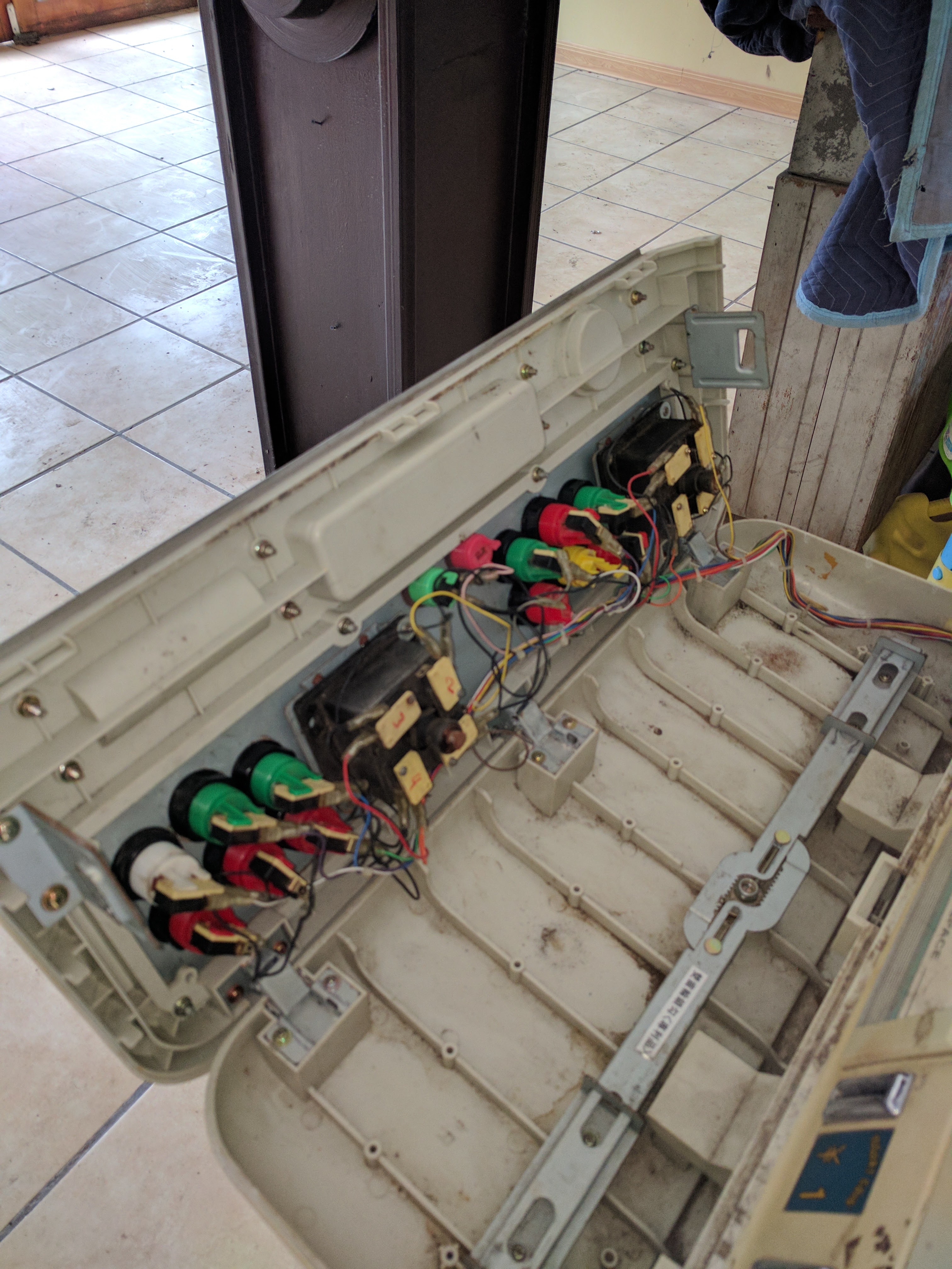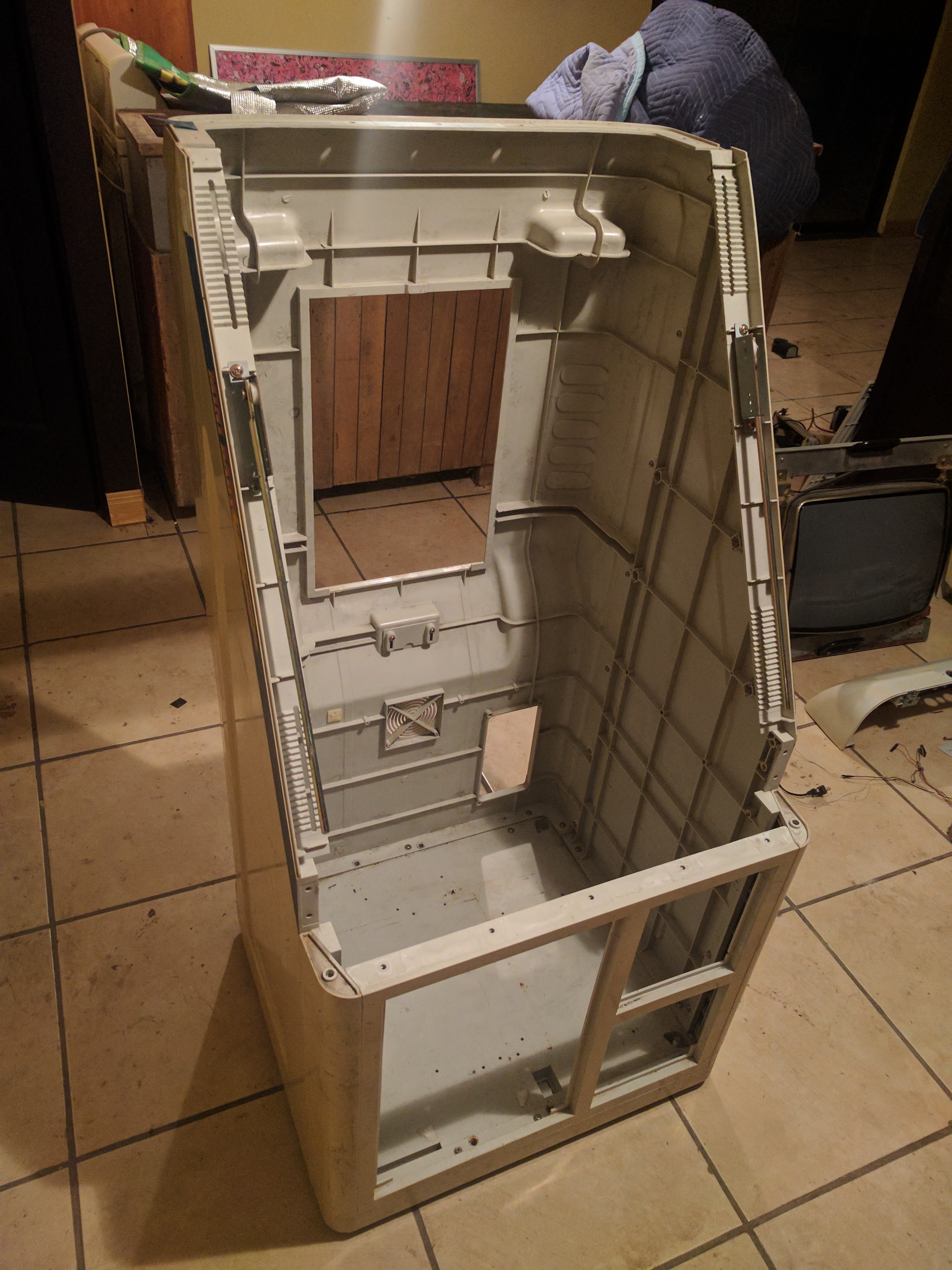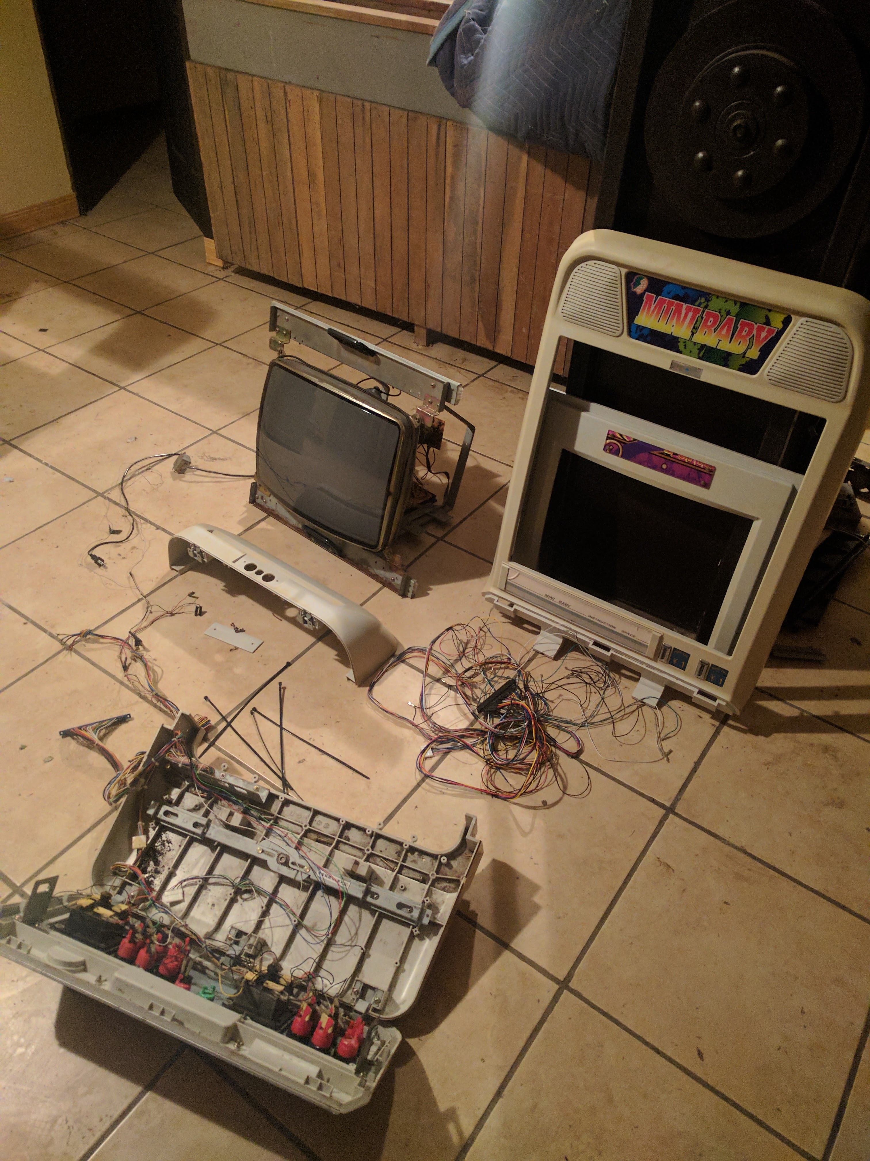 Pude tomar el tiempo para desarmar todo el gabinete, me di cuenta que se puede ajustar la altura por medio de una base para jugar de pie o bien sentado, optare por la ultima opcion, encontre en muy mal estado la fuente de alimentacion pero es funcional, no se si cambiarla o simplemente limpiarla, al desarmar note que los cables del audio del conector jamma no iba directamente al parlante sino a una clase de amplificador dentreo del gavinete y me parece excelente, adjunto las fotos del avance al desarmar.