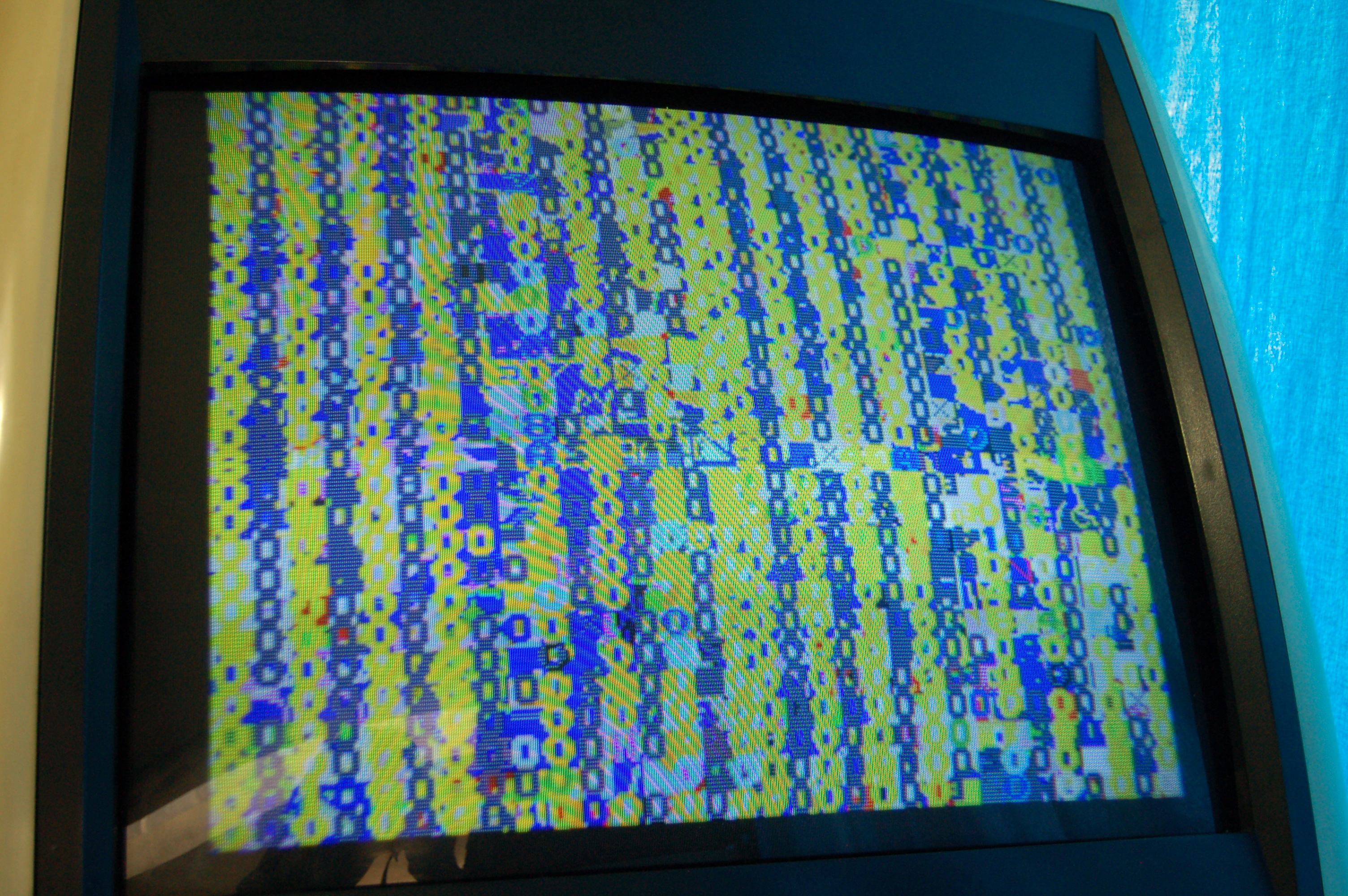 En otras palabras, las roms tsu_02b.1a y tsu_04b.1b entrelazadas un byte de cada una primero, seguidas por tsu_03b.2a y tsu_05b.2b. Emocionado corrí a probar mi nuevo Frankenstein, pero me recibió una pantalla muy similar llena de basura.