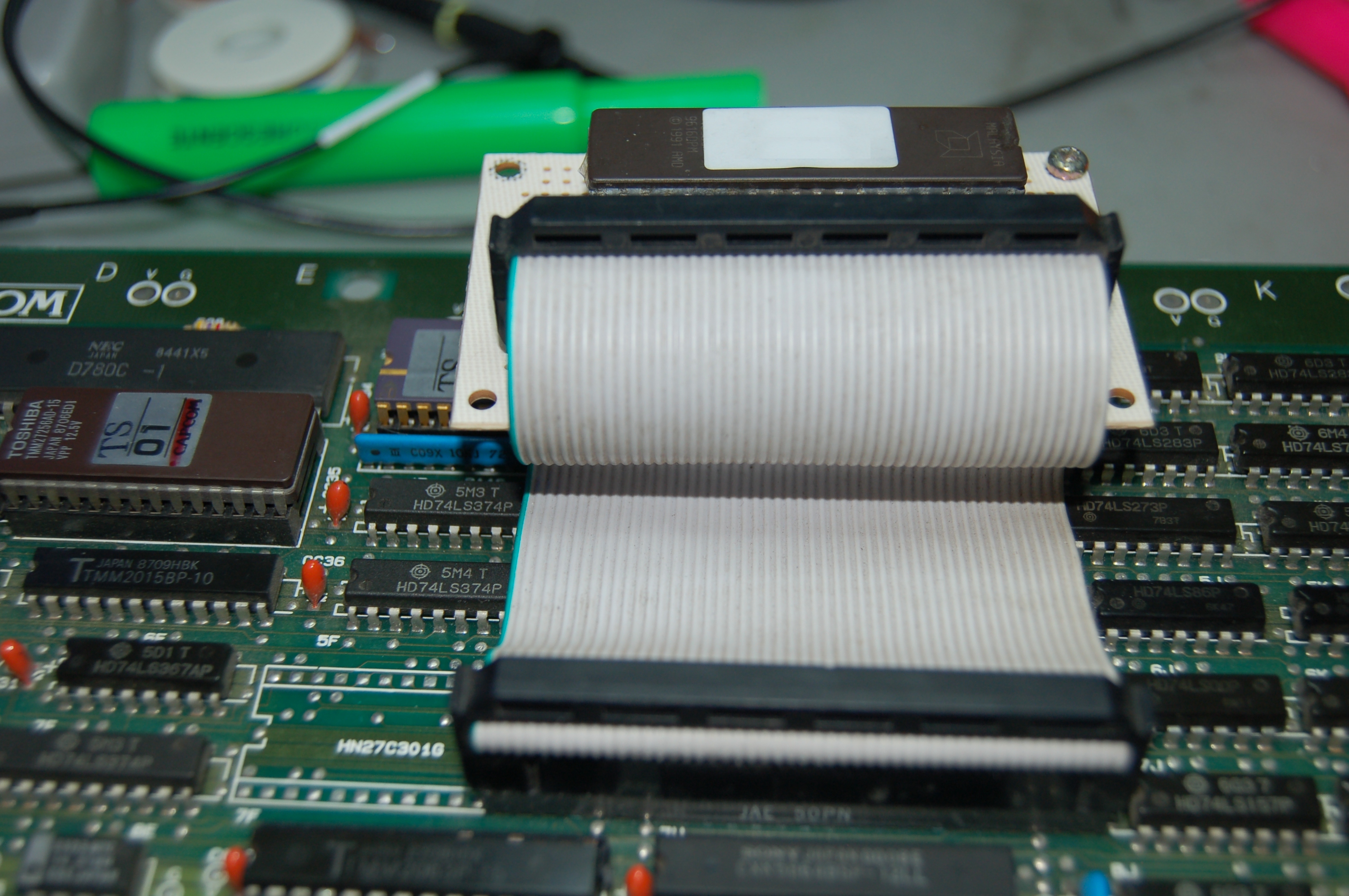 La PCB que faltaba - la C - contiene el código para el CPU 68000 del juego, sobra decir que no funcionaría sin ella. Se me ocurrió que podía substituirla con algo adaptado, después de todo sólo se trataba de datos, no de lógica del hardware. Por suerte dicha placa se conecta a la principal por medio de un conector en el cual entra perfectamente un cable "ide" de 50 pines, de los cuales tenía uno a la mano de una pcb pirata; y también contaba con un conector de pines para el otro extremo del cable y poder realizar la adaptación necesaria.