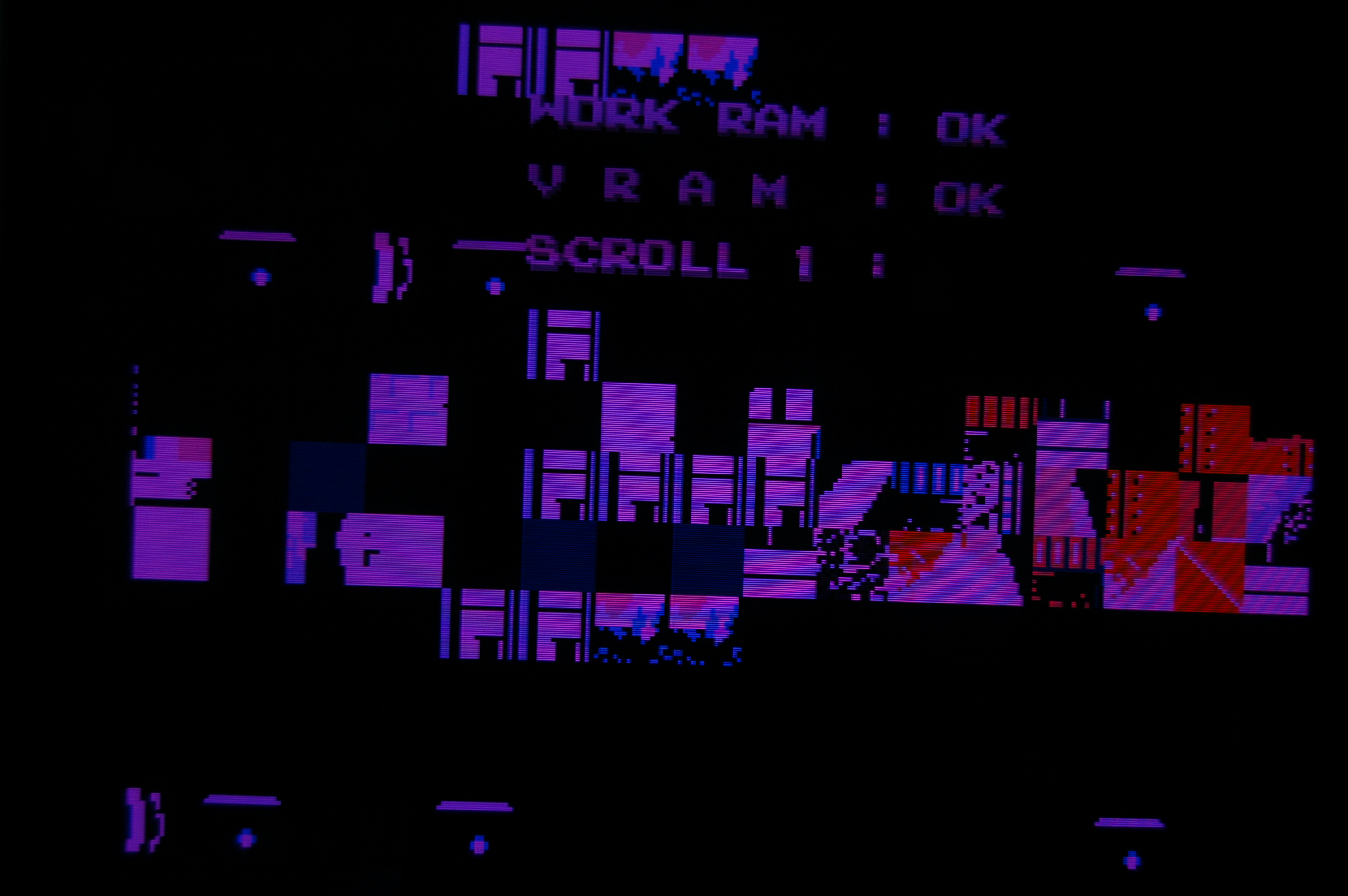 Cuando el juego arranca, después de inicializar la memoria de video y paletas de color para desplegar el texto, arranca a revisar la Work RAM, seguida de VRAM, Scroll 1, Scroll 2 y luego la ROM. ¿A que corresponde cada uno de ellas? Algunas son fáciles de adivinar del código de MAME y la documentación. Working RAM es la misma que Work RAM, pero ¿cuáles son VRAM y las dos scroll? Me interesaba saberlo para tener indicios de cuales de los - por lo menos - 14 chips de RAM de ambas placas debía revisar.