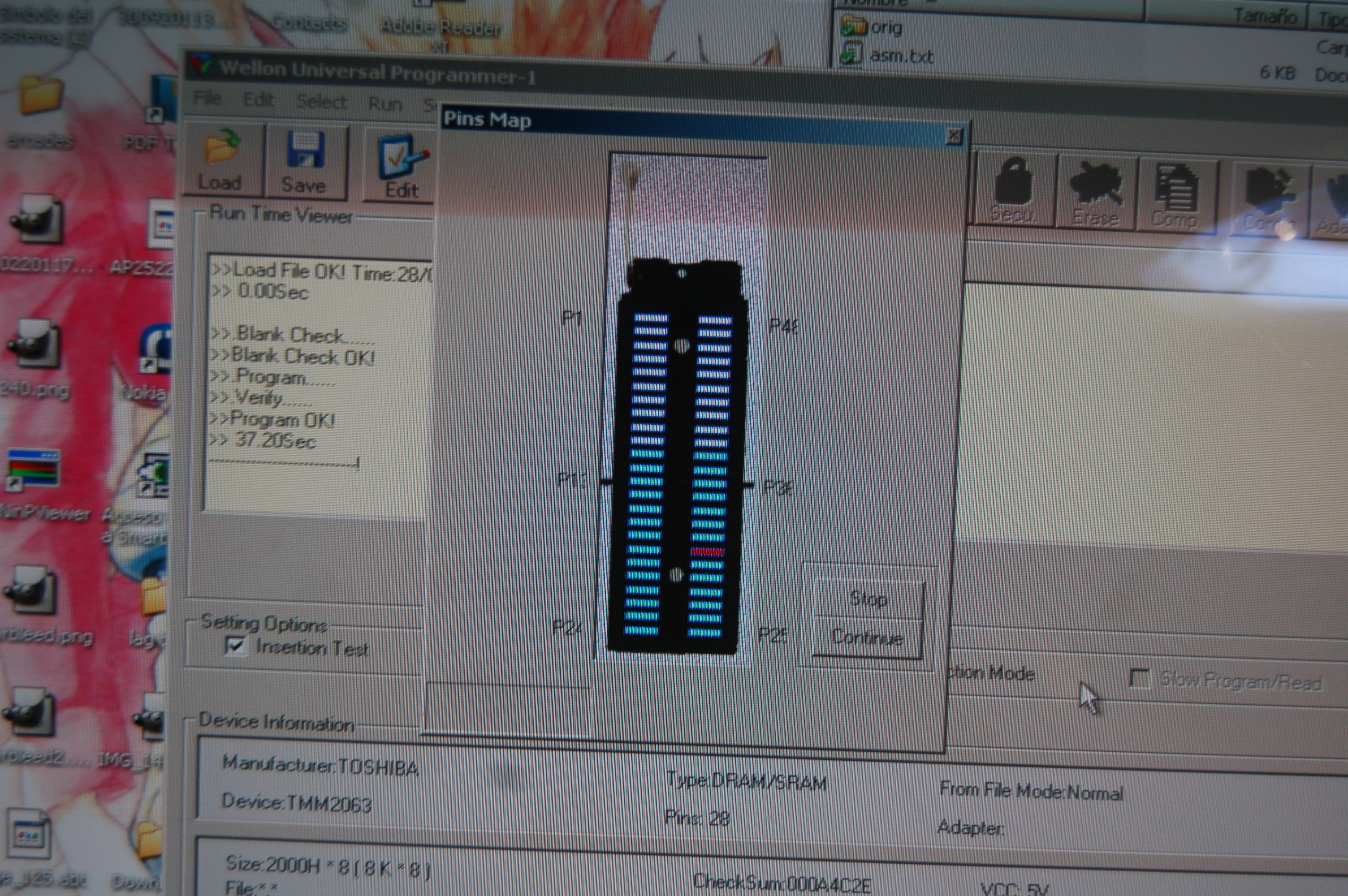 Ya desesperado, empecé a intentar la técnica del "piggyback". Es decir, montar un chip que funciona sobre el que se sospecha que tiene daño. Y si hay algún cambio o se arregla, asegurarse y reemplazarlo. Hacer piggyback tiene sus riesgos, ya que se pueden arruinar ambos chips al hacer la prueba. Pero en este caso resultó bien.