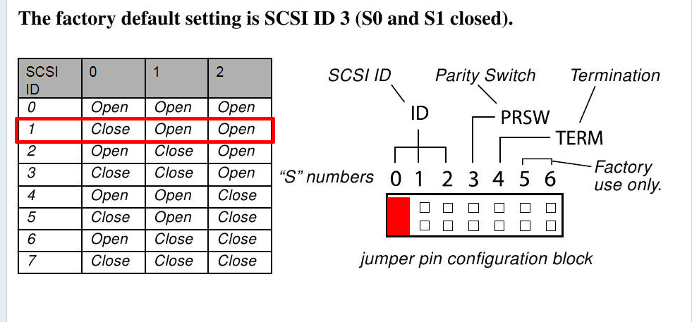 Allí puedes ver como ponerlo en SCSI ID 1 y la paridad, que parecen ser los que están mal.