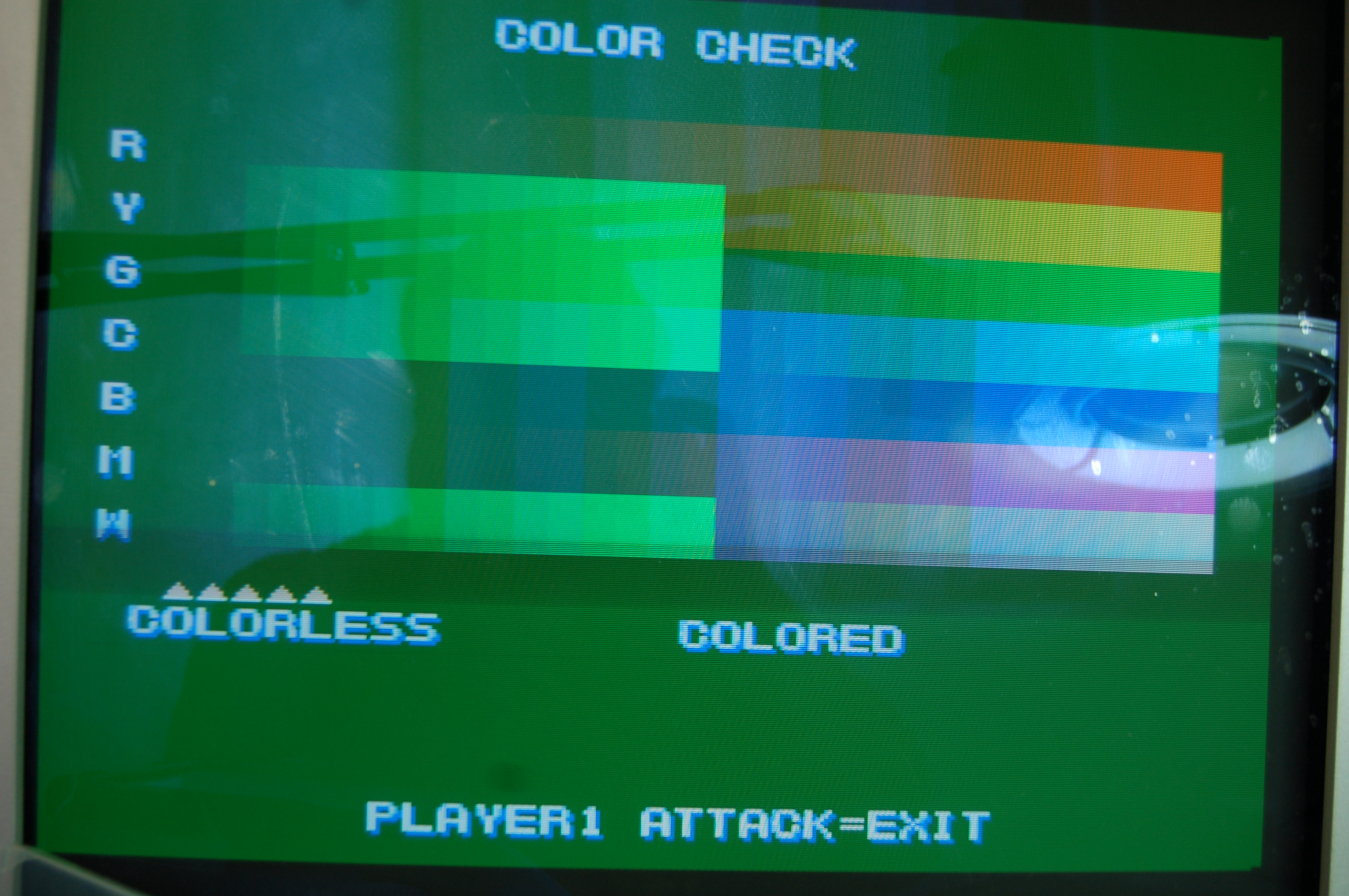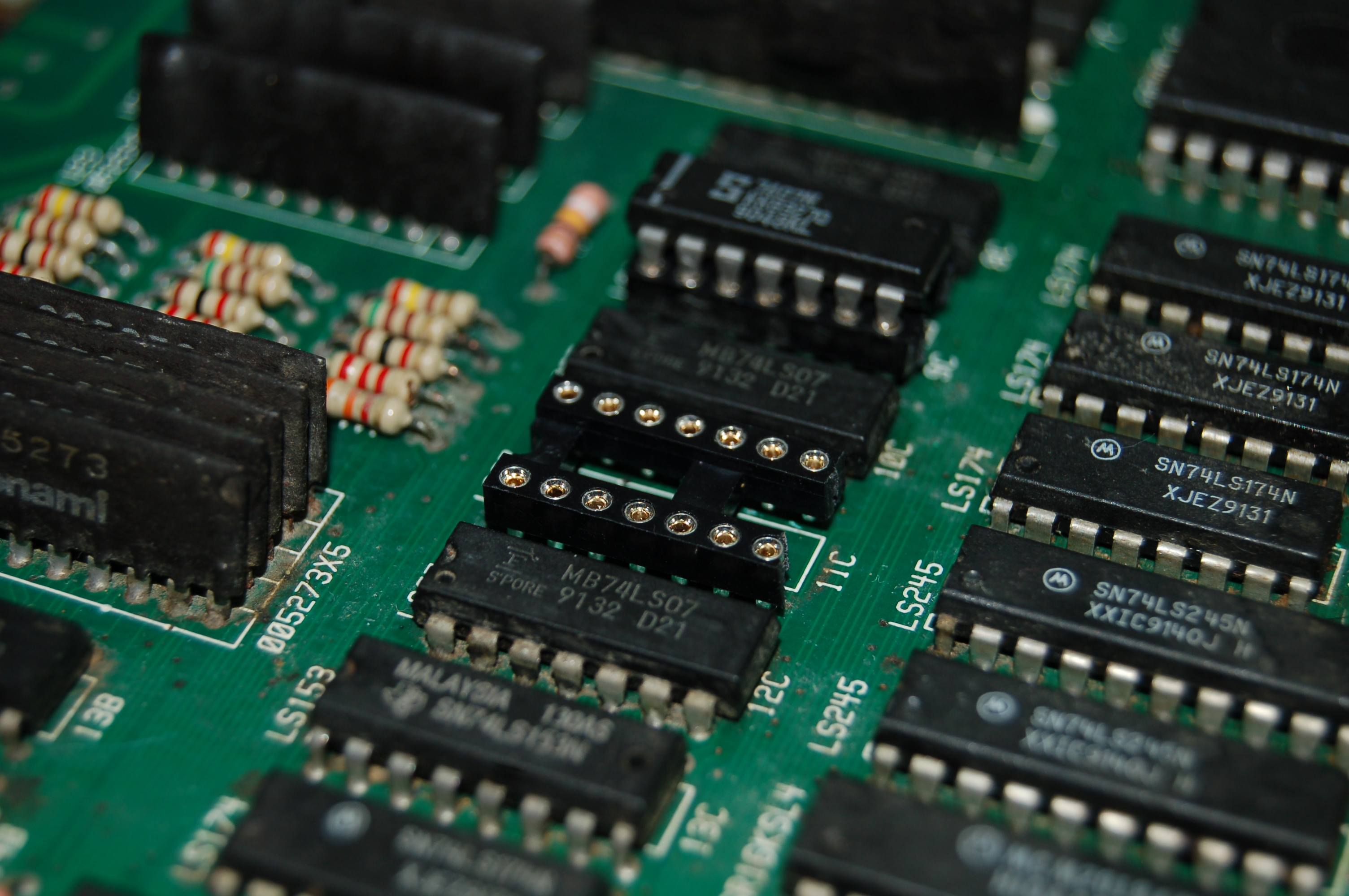 Lo primero fue determinar si en realidad el verde estaba saturado, o si los otros dos colores estaban atenuados de alguna manera. Es por eso que utilicé la pantalla de prueba de color de la placa. Para determinarlo, buscando en el diagrama fue al TTL que estaba más cercano a la salida del verde en el conector JAMMA y le conecte a tierra con una punta con caimán. Resultó ser efectivamente el canal verde, en un 74LS07. Curiosamente los 74LS07 a al salida son todos Fujitsu, y esta marca es infame por producir malos TTLs en esa época.