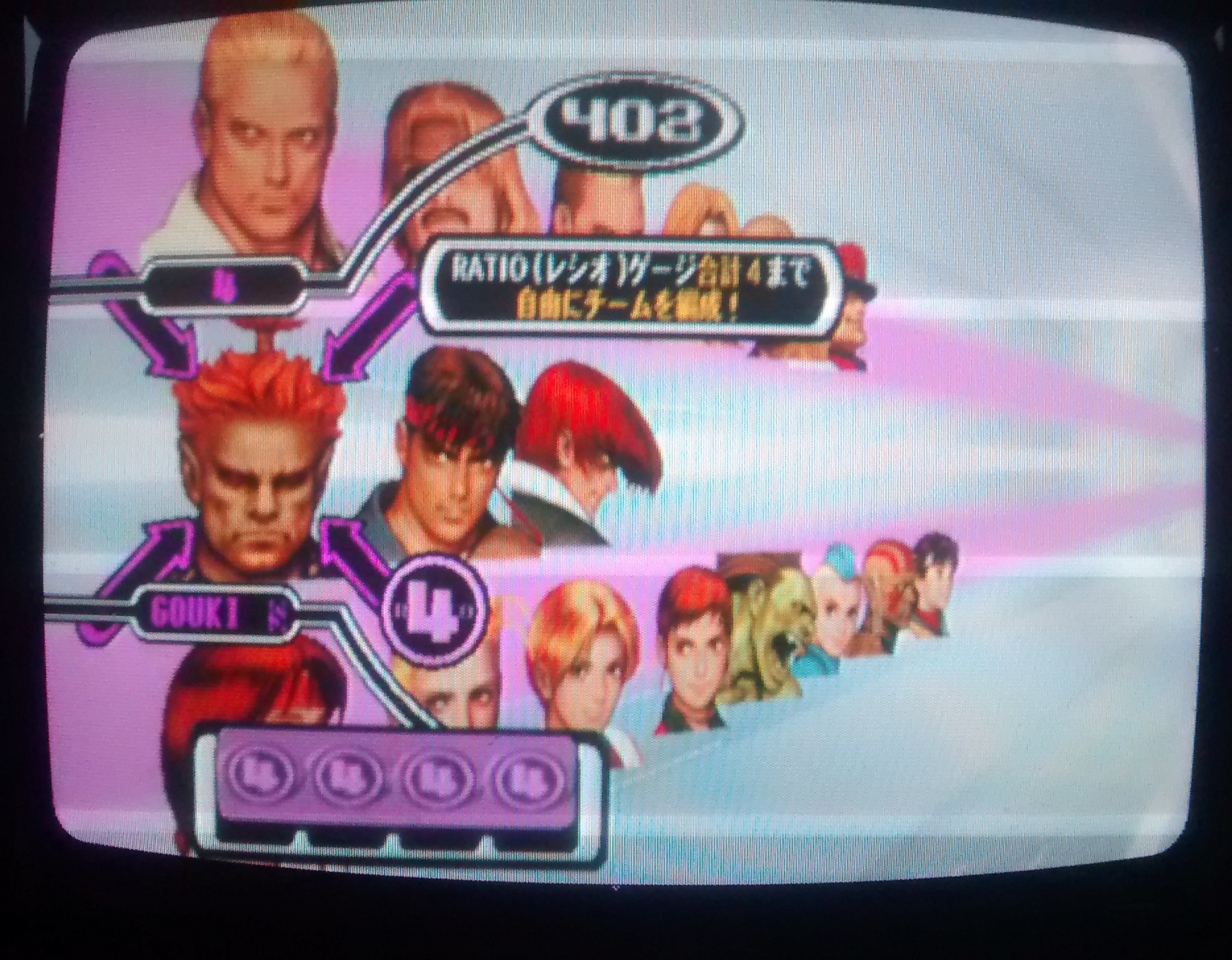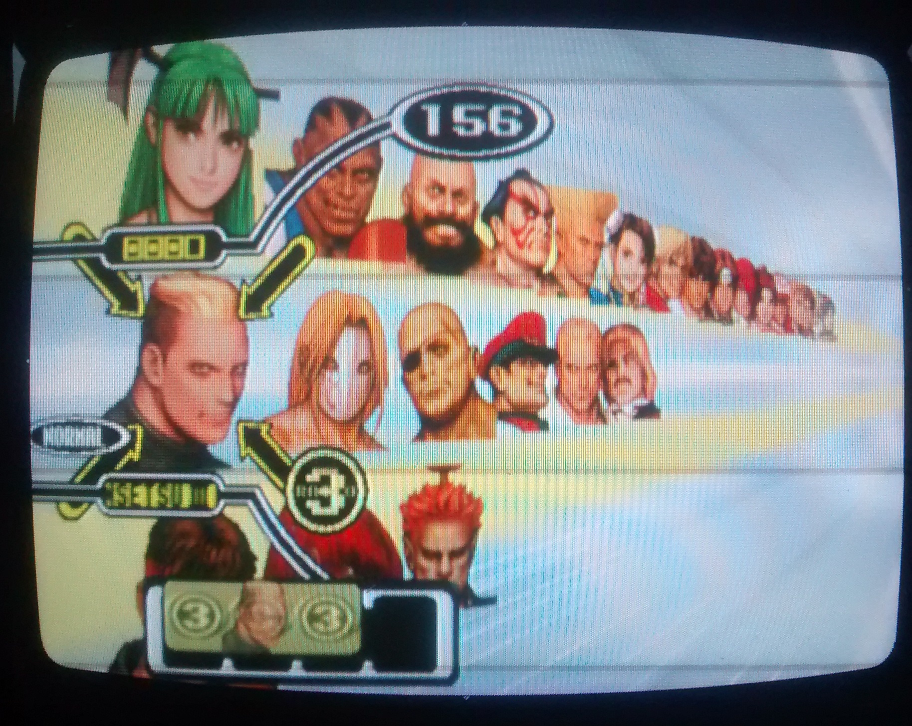 Capcom vs snk en sega naomi es un juego bonito y tiene cosas x desbloquear; la version JAPAN trae a yamazaki desde el inicio en el plantel de peleadores (foto1)asi como a morrigan y nakoruru extras en comparacion con la version americana, esto se debe al bios que utiliza el sistema; en fin para accesar a TODO EL CONTENIDO EN LA VERSION JAPAN se utilizan 2 passwords los cuales hay que meter uno primero y despues el otro para que no se bloqueen las cosas, cabe señalar que hay mas passwords rondando por internet, pero estos solo desbloquean cosas en partes y bloquean el verdadero contenido intersante del juego.